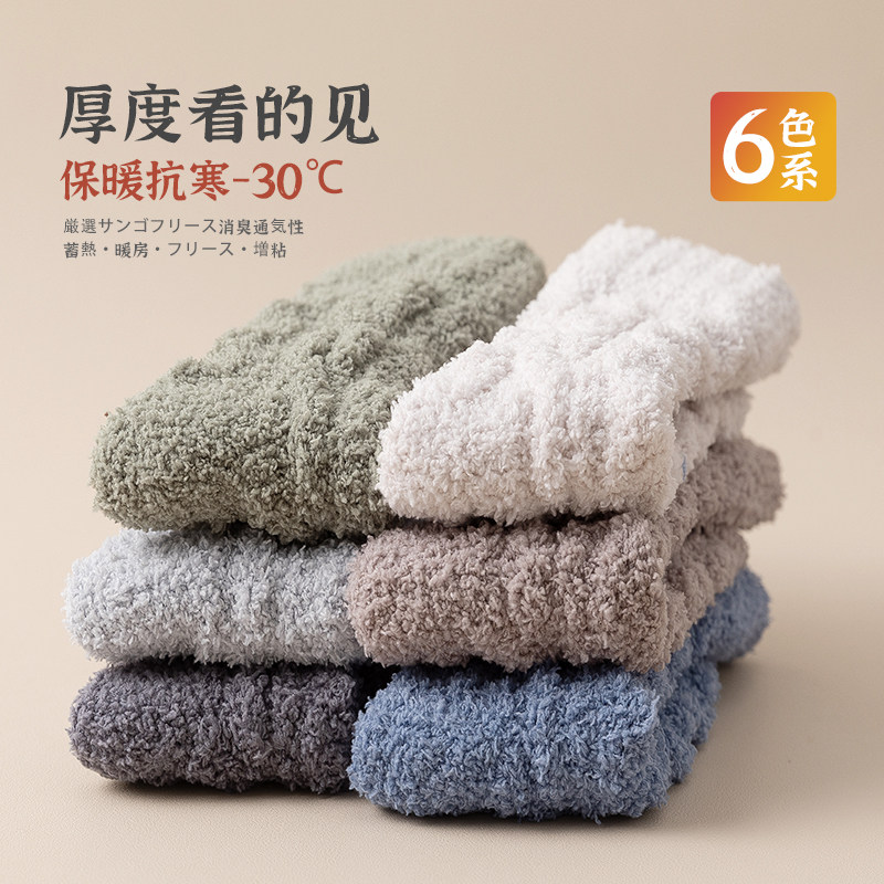 珊瑚绒袜子男款秋冬季加绒加厚保暖中筒袜冬天睡眠地板袜纯色长袜