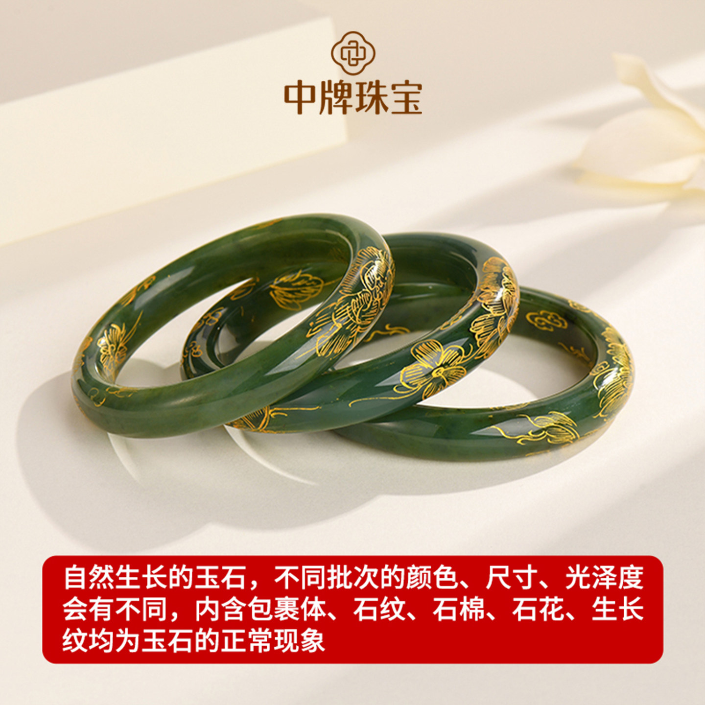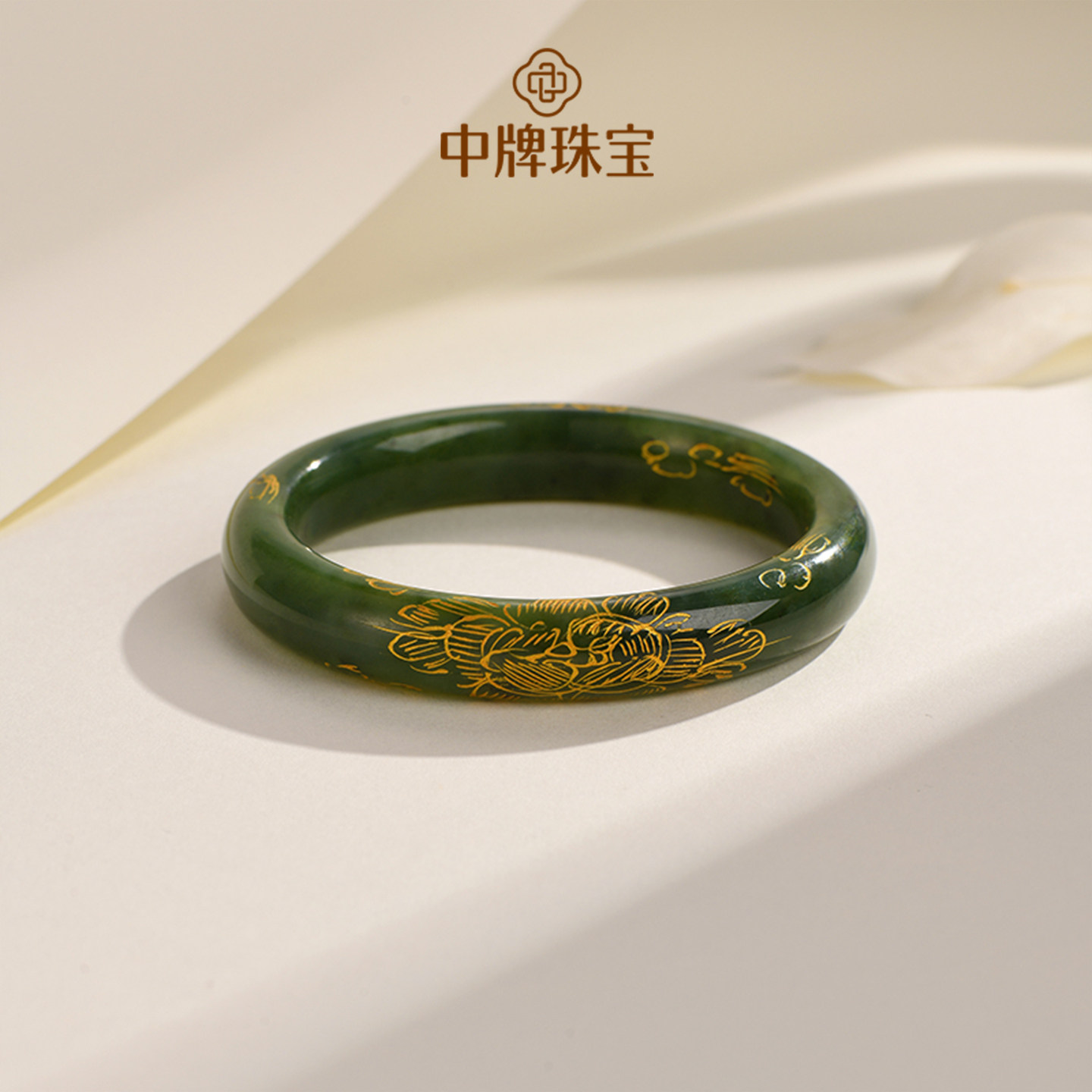 碧玉描金牡丹花玉镯金玉满堂天然和田玉手镯花开富贵雕花镯子细料