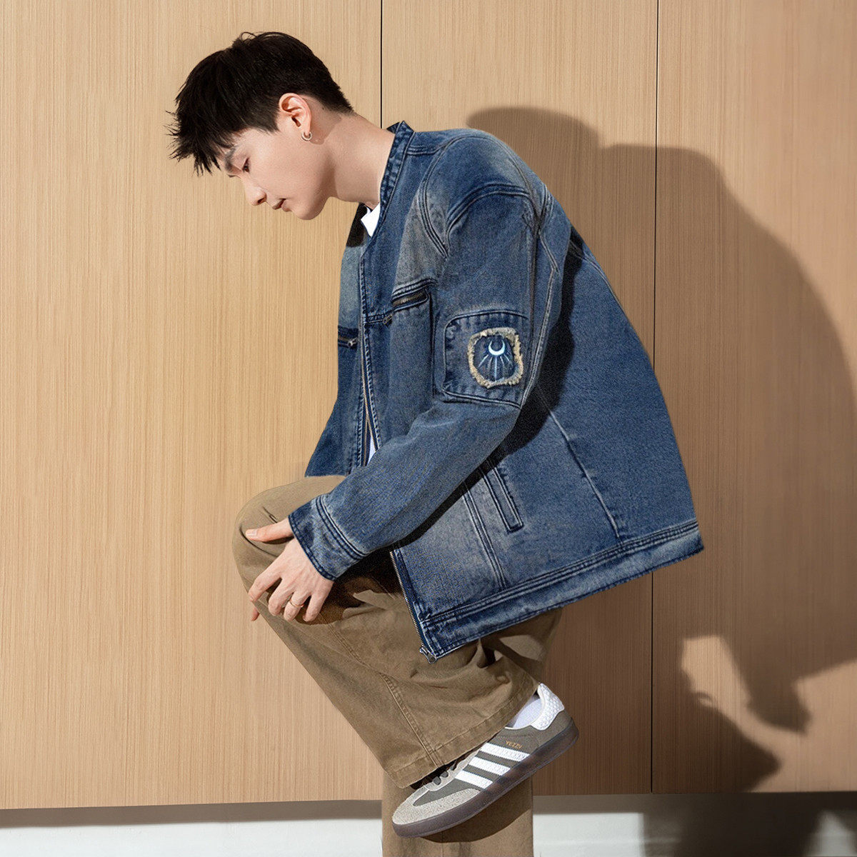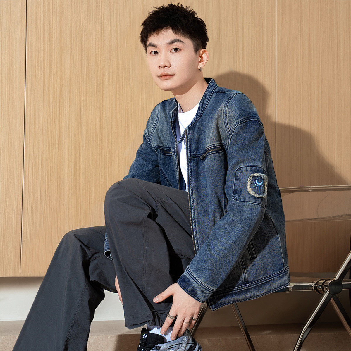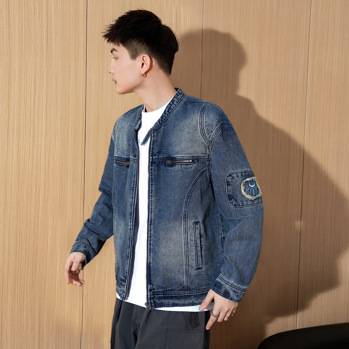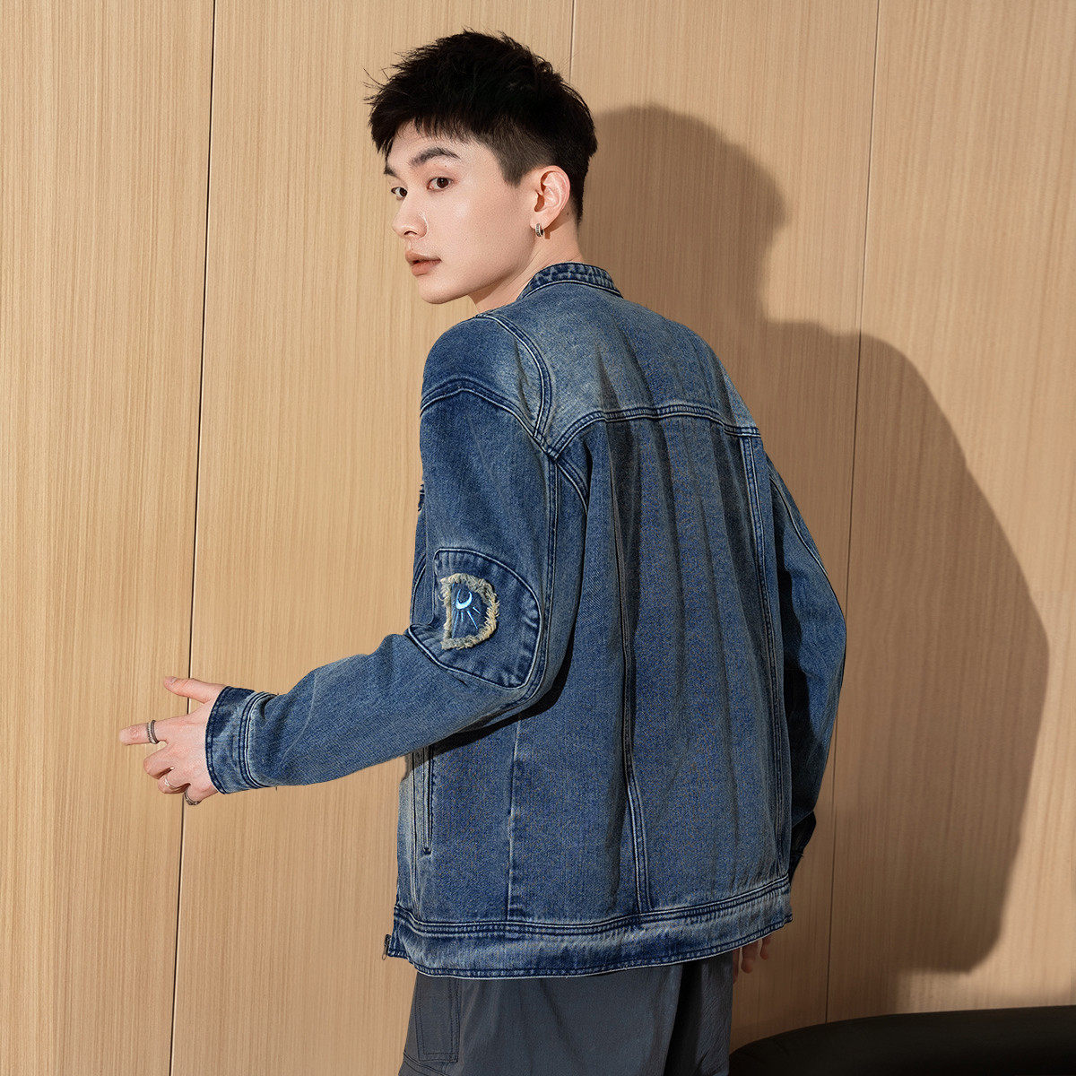 唐狮秋季新款男牛仔外套水洗小立领正肩上衣拼接设计感夹克潮TMTA