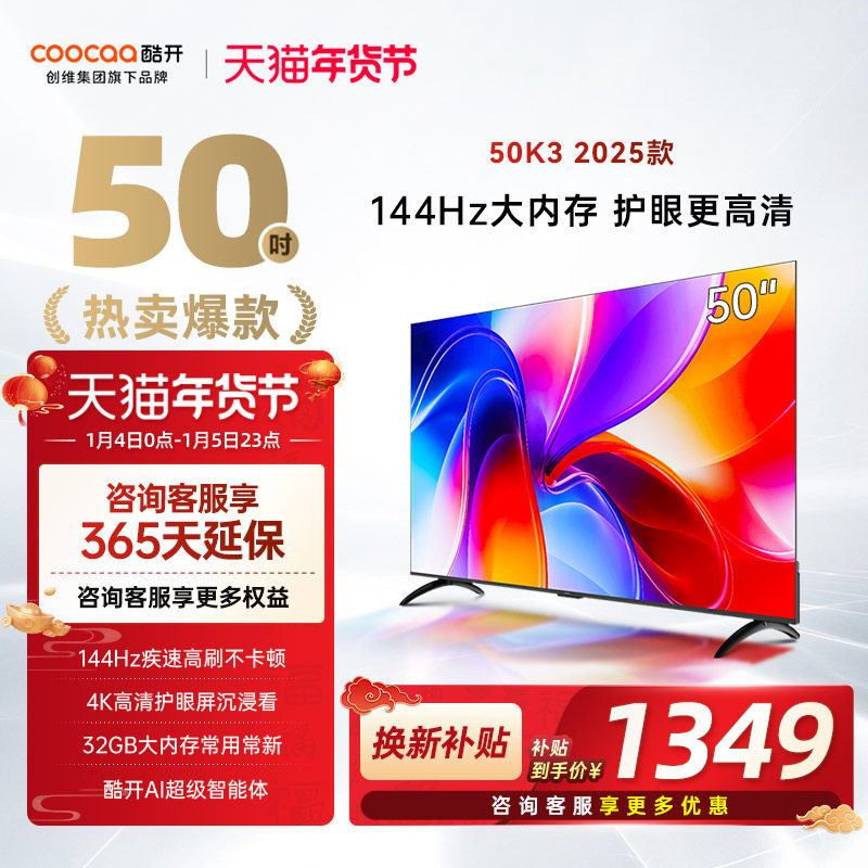 创维酷开K3 50英寸2025新款4K大内存液晶家用电视机以旧换新补贴