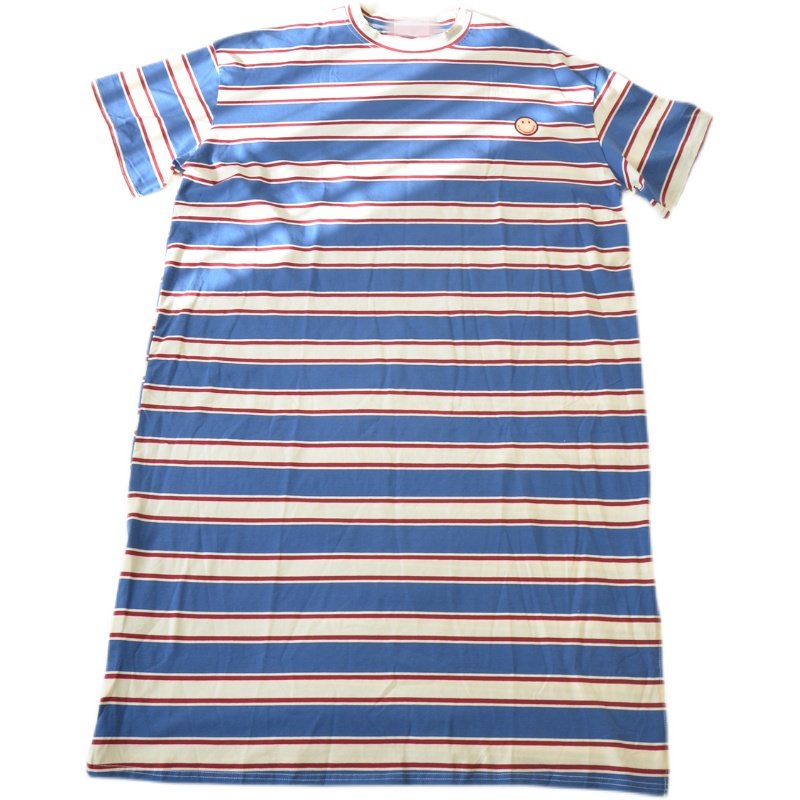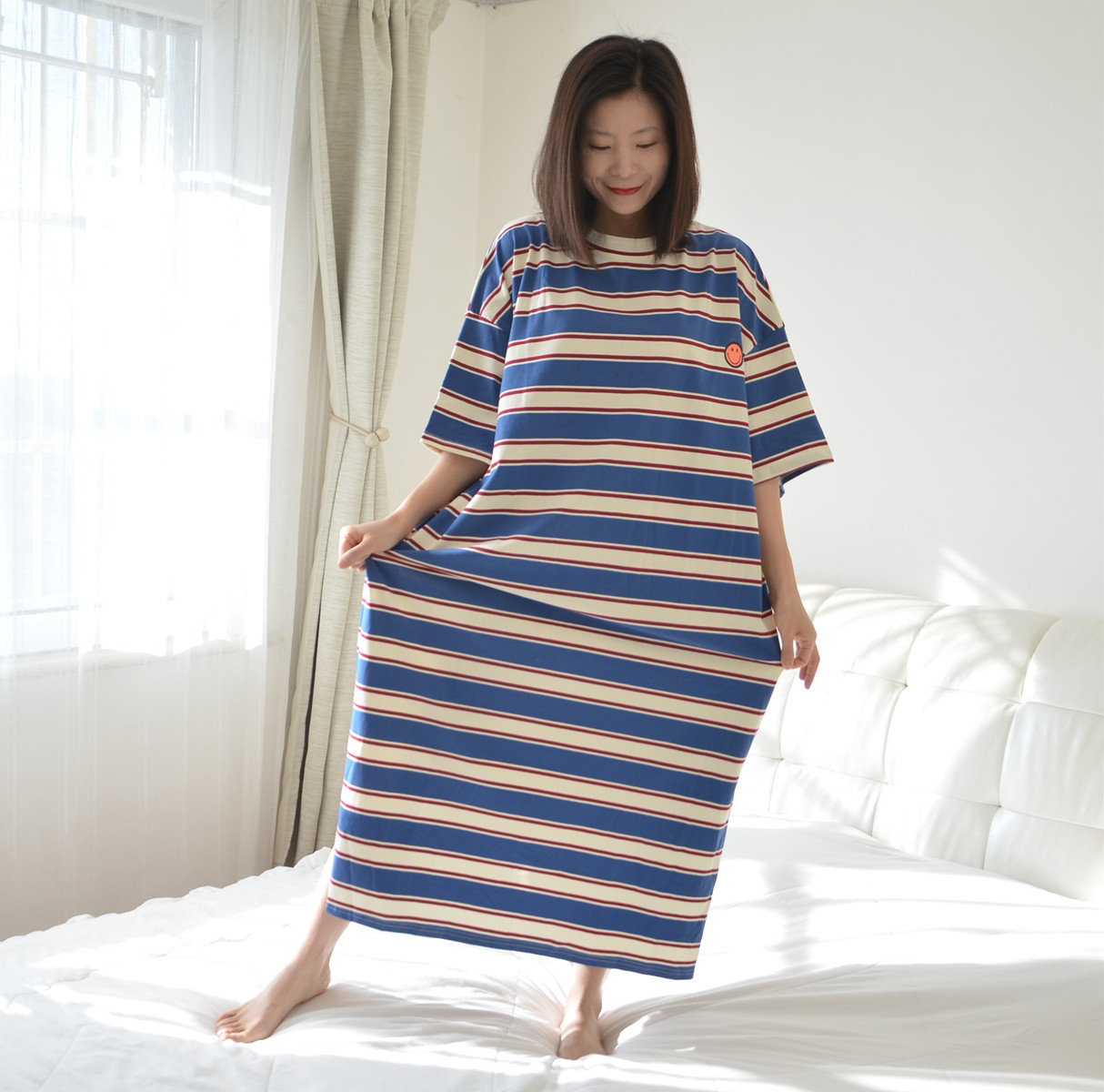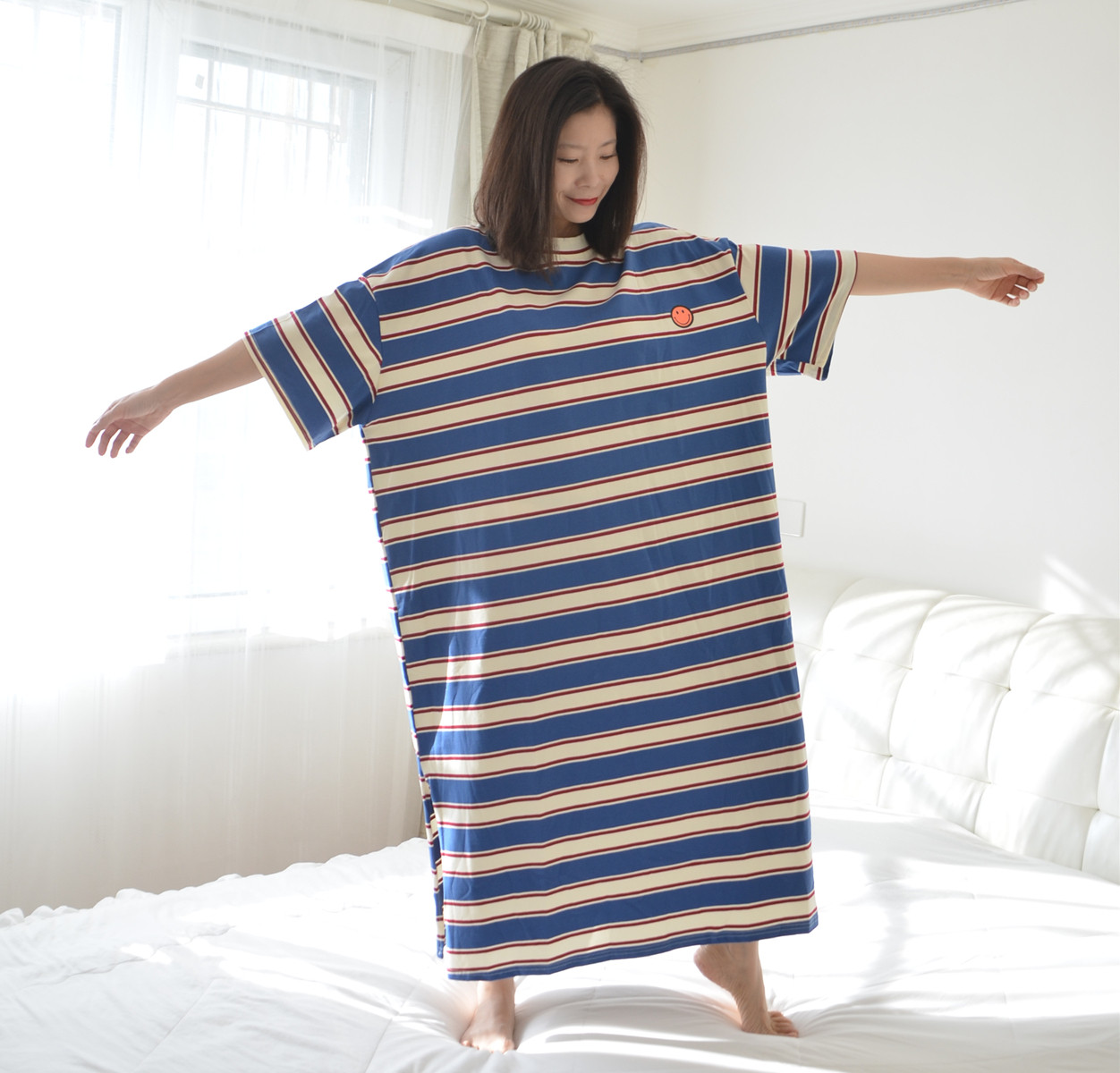 200斤加大码条纹睡裙女夏季短袖长款针织纯棉胖MM宽松慵懒家居服