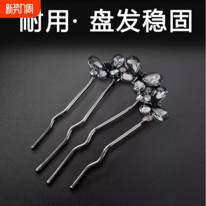 水钻蝴蝶四齿插梳U型发簪新中式懒人盘发固定神器丸子头固定发夹