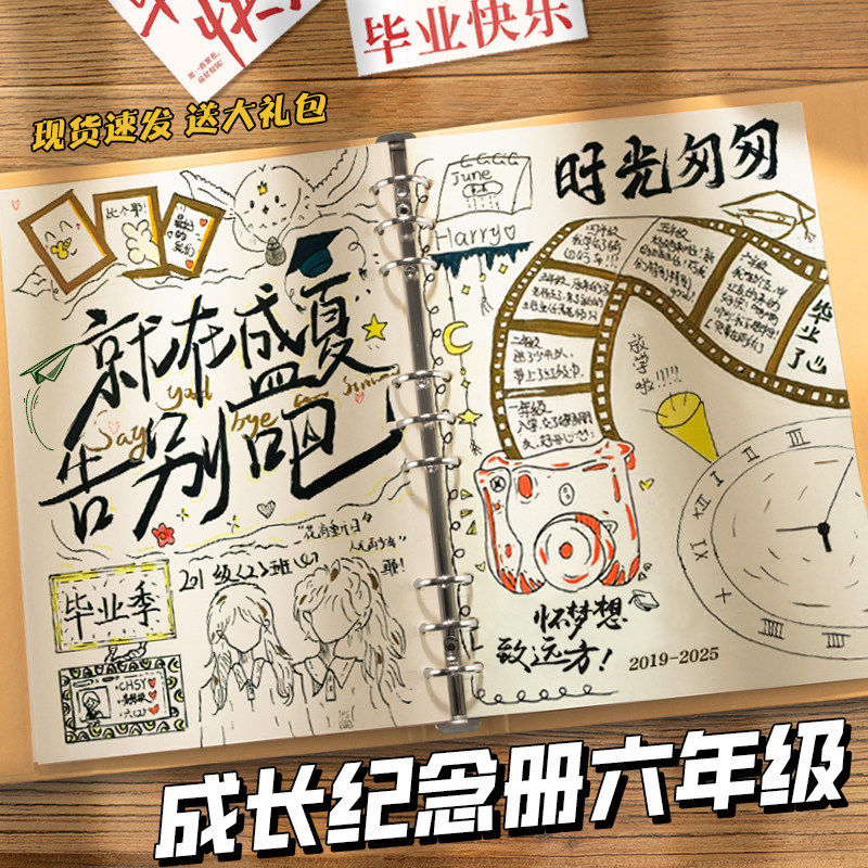 成长纪念册diy材料DIY儿童成长纪念册空白活页手账本 小学生六年级纪念相簿 手绘插画风格记录册制作材料