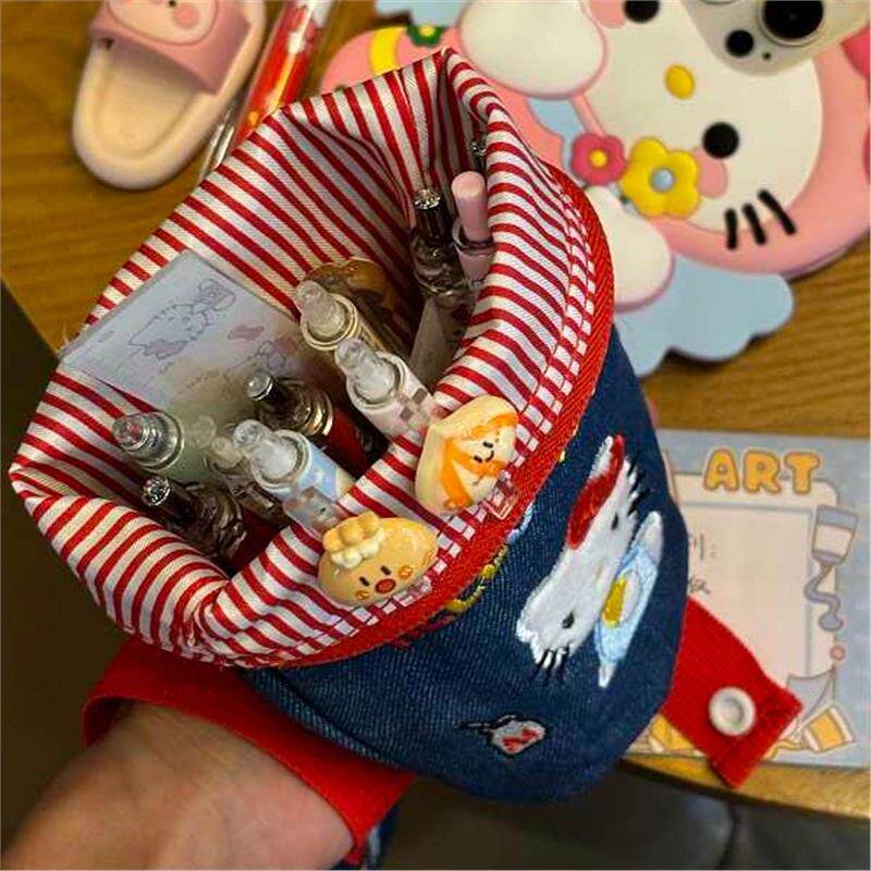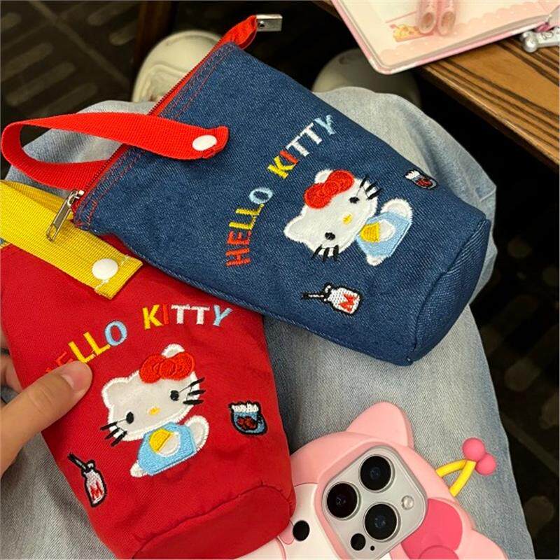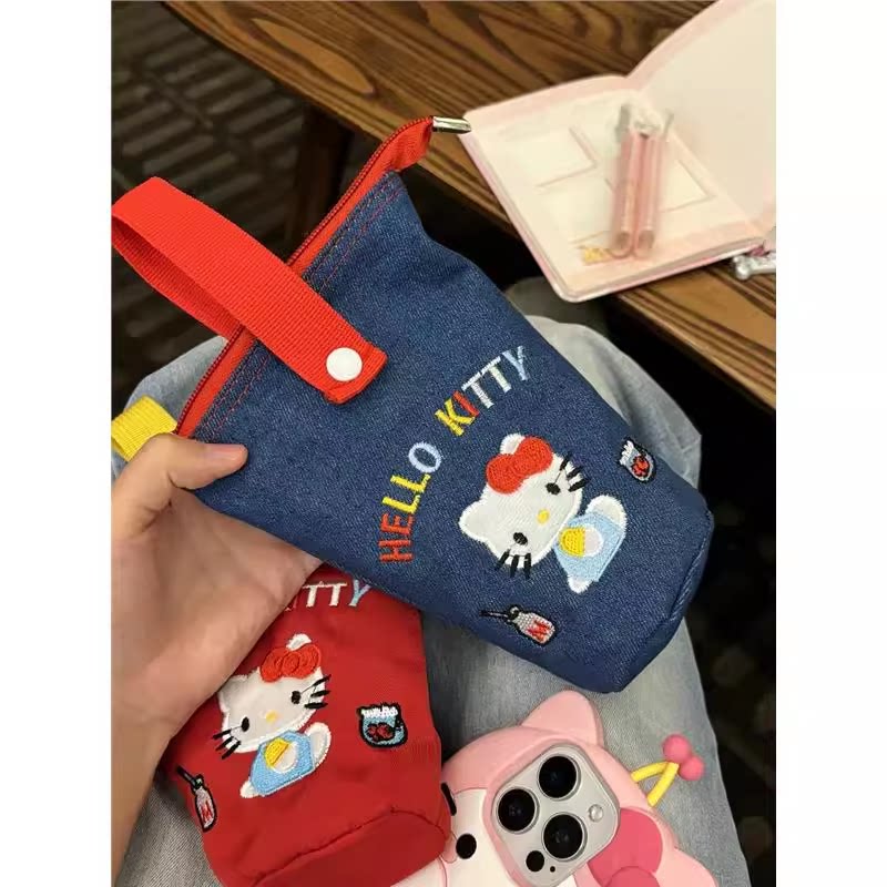 可爱凯蒂猫刺绣笔袋手提化妆包便携小包包随身包红色