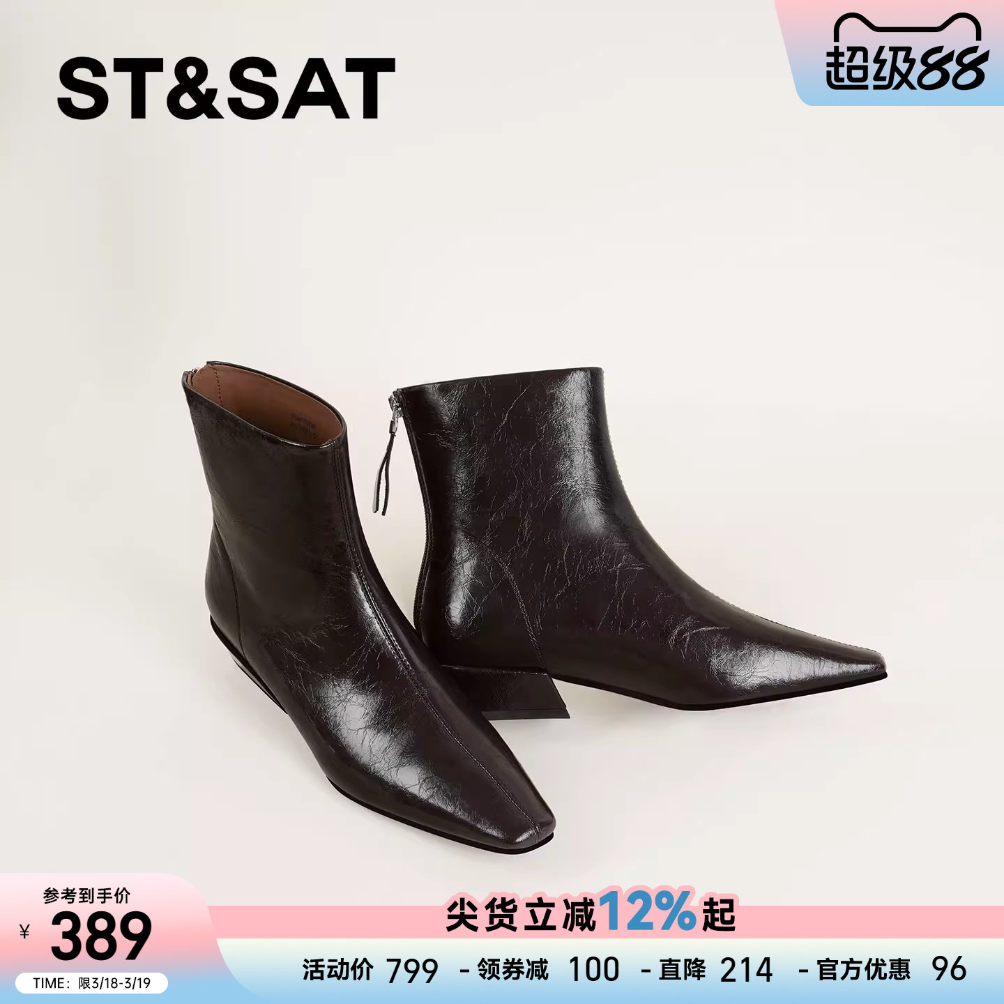 星期六法式短靴女2025秋冬气质方头粗跟高级感裸靴真皮英伦风皮靴