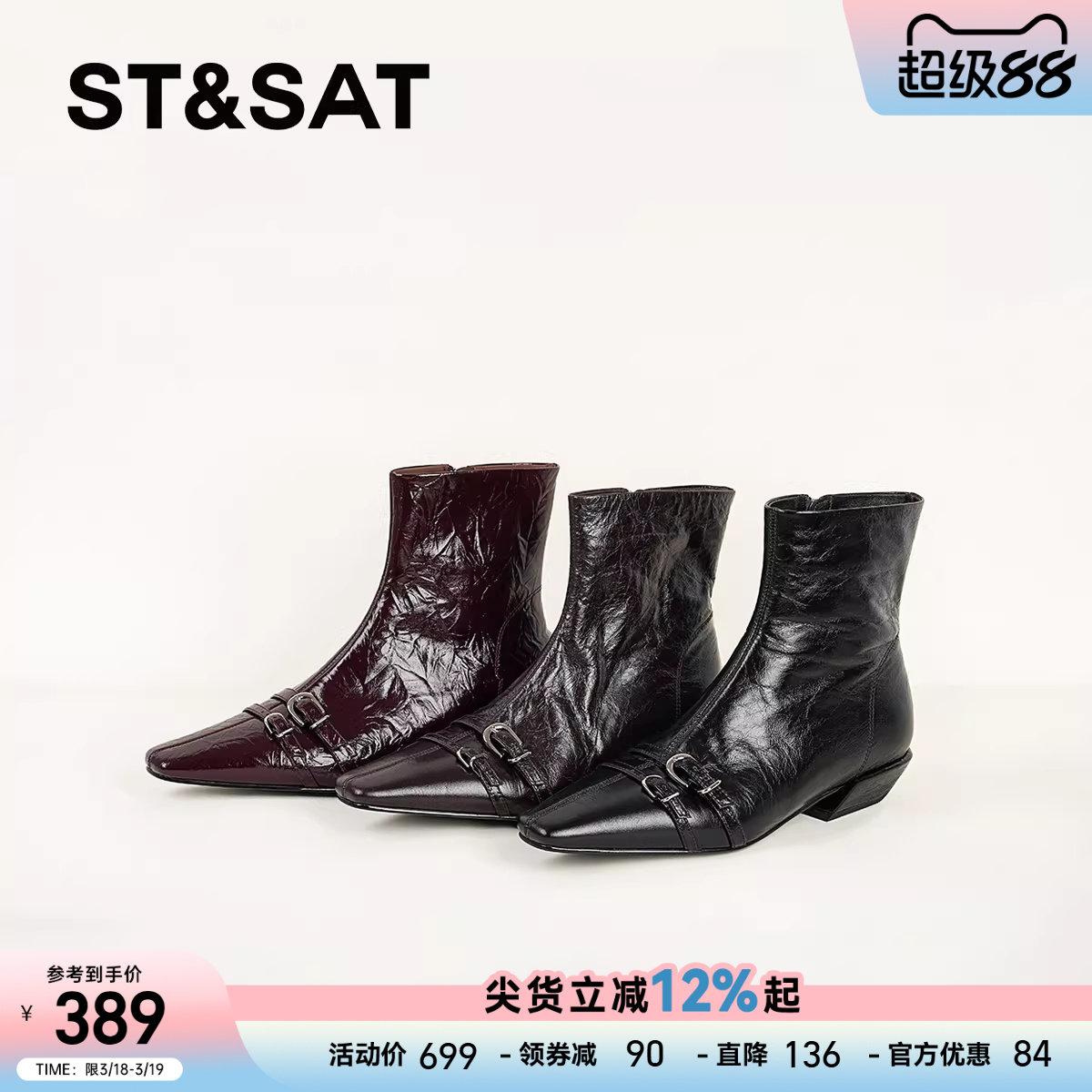 星期六黑色短靴女2025秋冬方头英伦风粗跟切尔西靴真皮侧拉链单靴