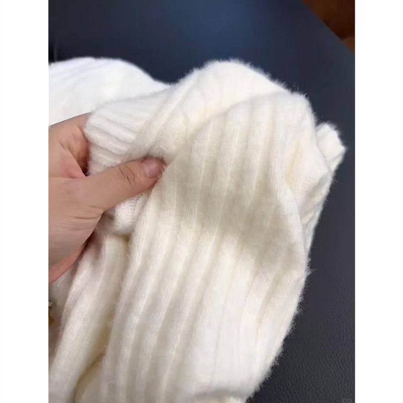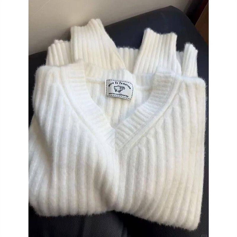 韩系慵懒风白色v领长袖针织毛衣女春秋冬高级感大码内搭打底上衣