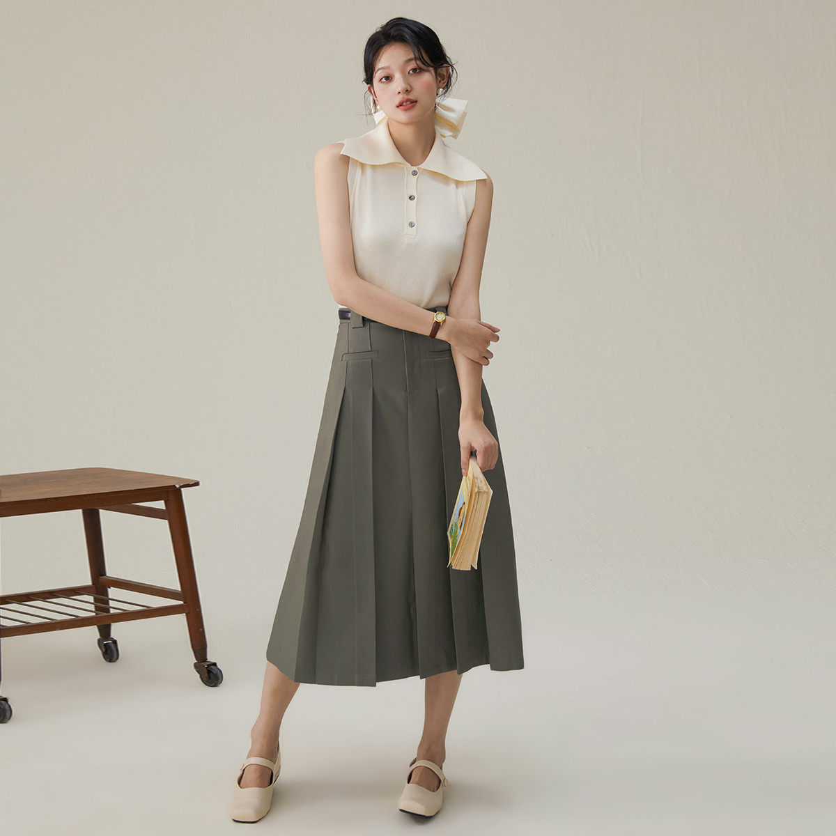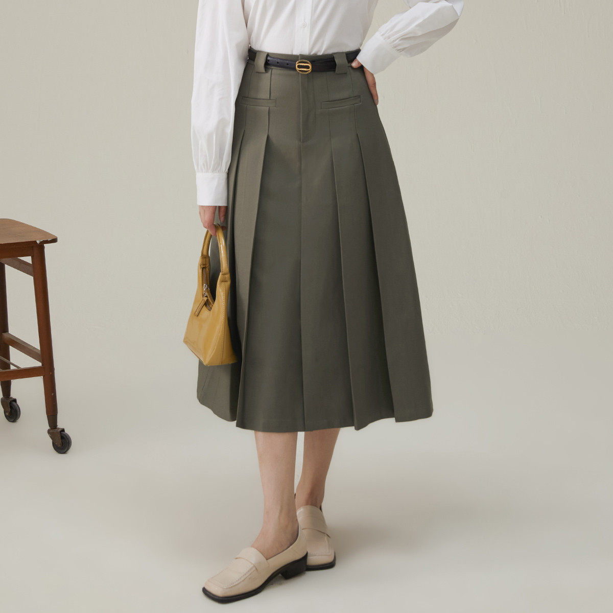 one more咖色半身裙2025夏季新款高腰遮胯A字裙中长款西装百褶裙
