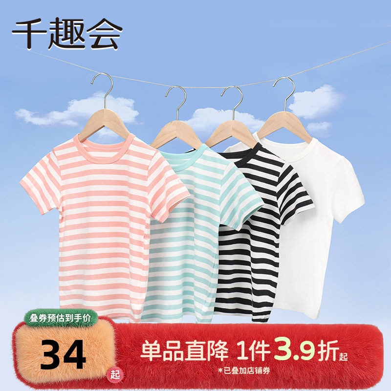千趣会夏款幼儿园宝宝短袖T恤男女童薄款透气纯棉条纹打底衫