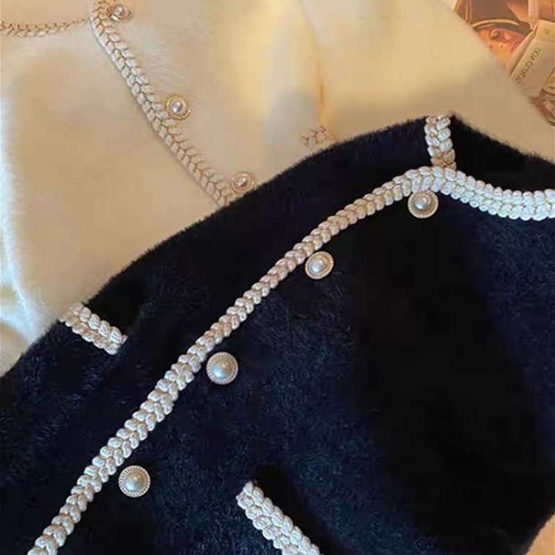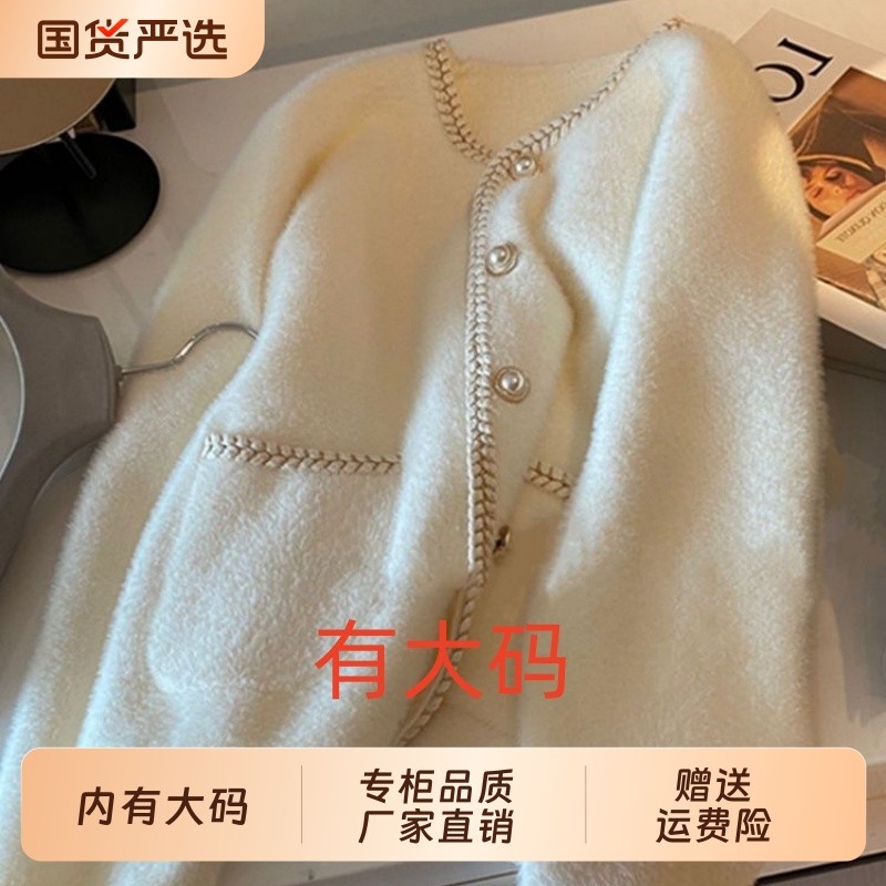 法式小香风珍珠扣毛衣开衫女上衣春秋大码内搭白色软奶水貂绒针织
