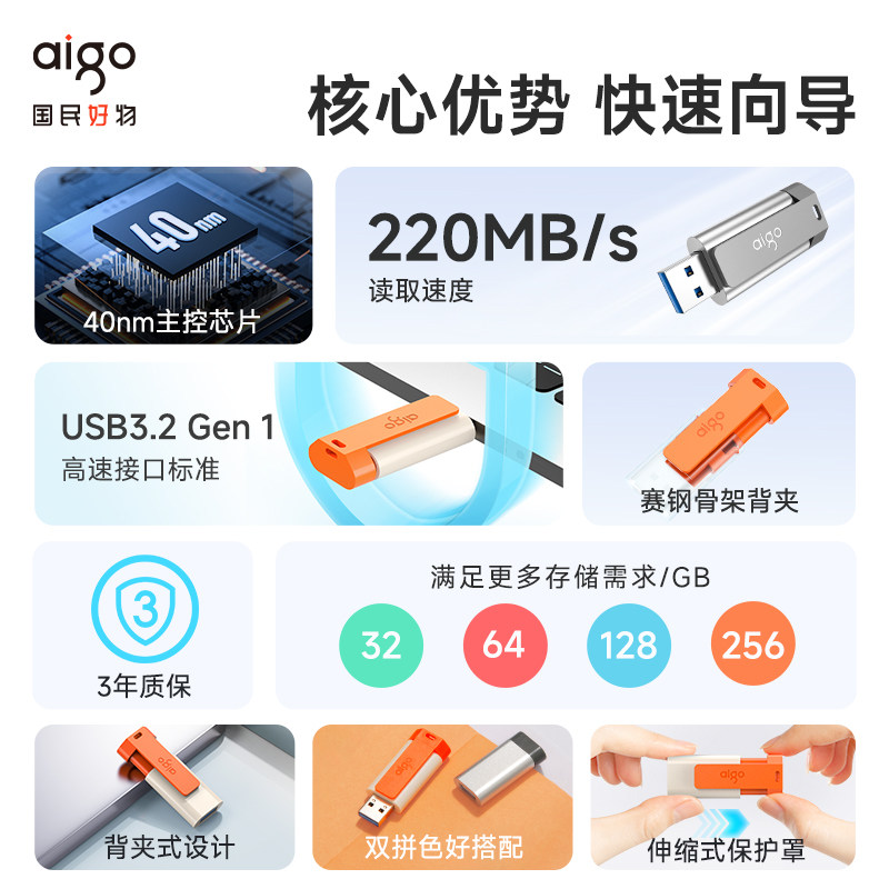 爱国者u盘128g大容量车载高速USB3.2可爱手机电脑两用优盘64g正品