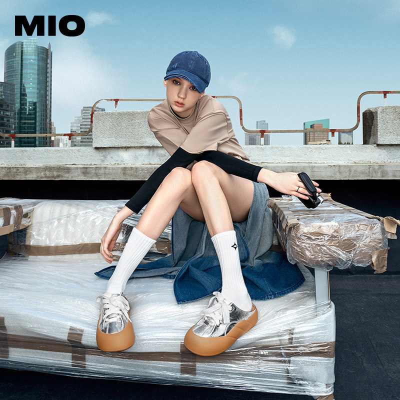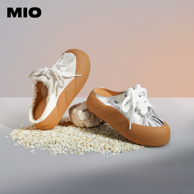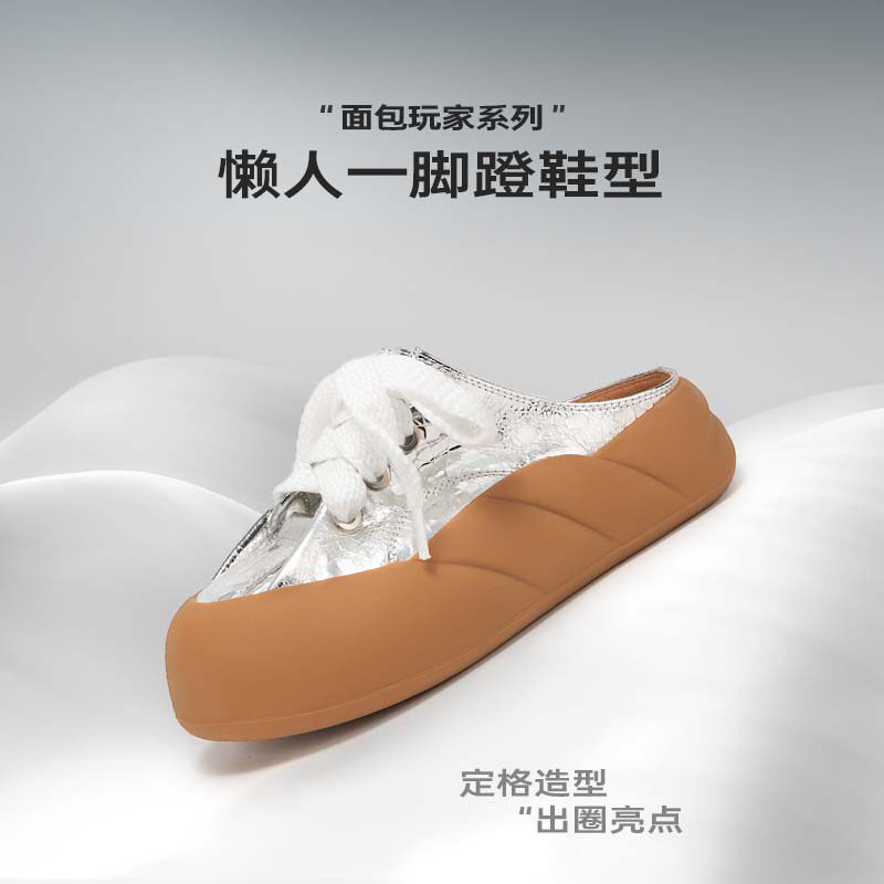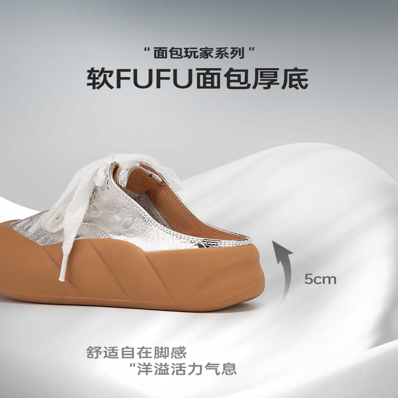 MIO米奥女鞋外穿运动拖鞋懒人一脚蹬面包鞋板鞋厚底5cm银色半拖