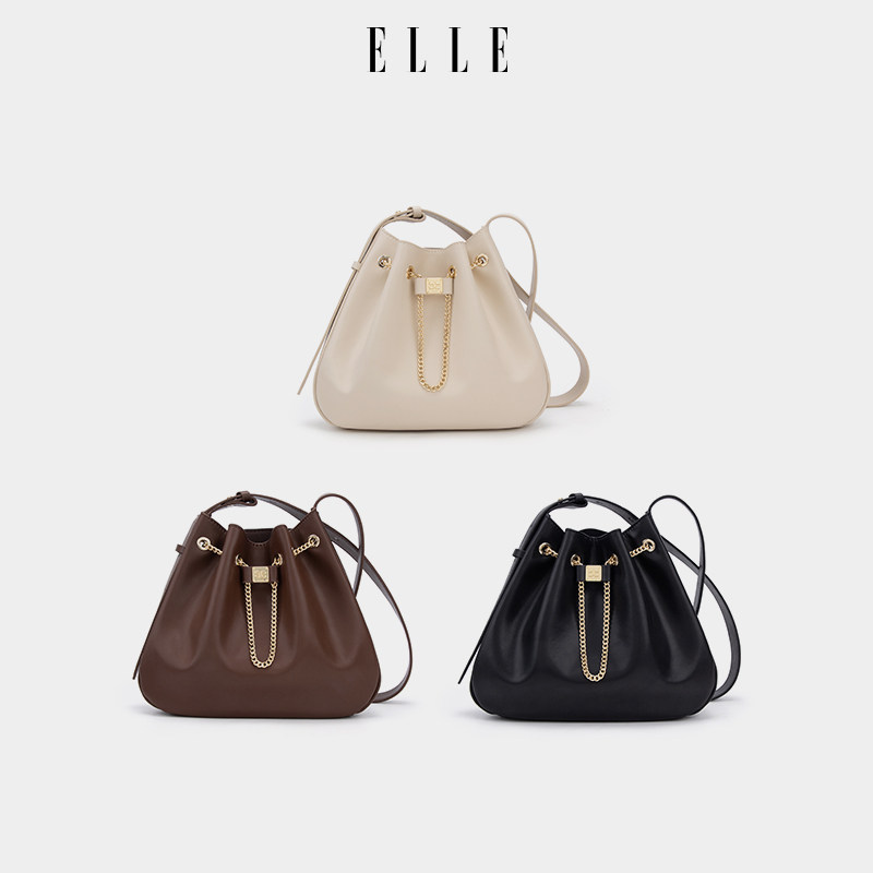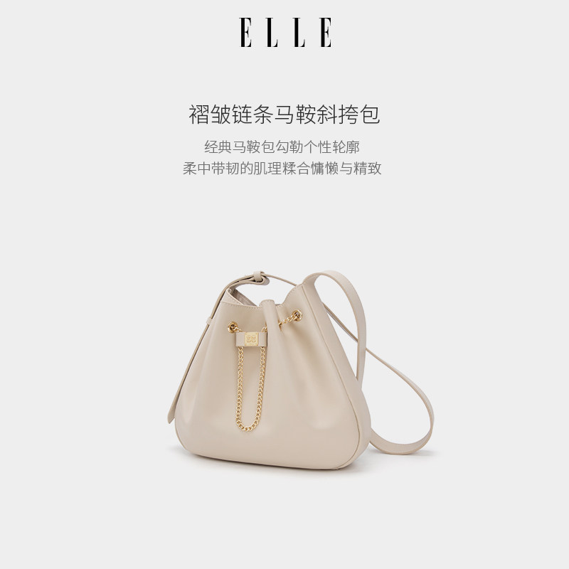 ELLE女包2025新款包包褶皱链条马鞍斜挎包女通勤时尚抽绳单肩包