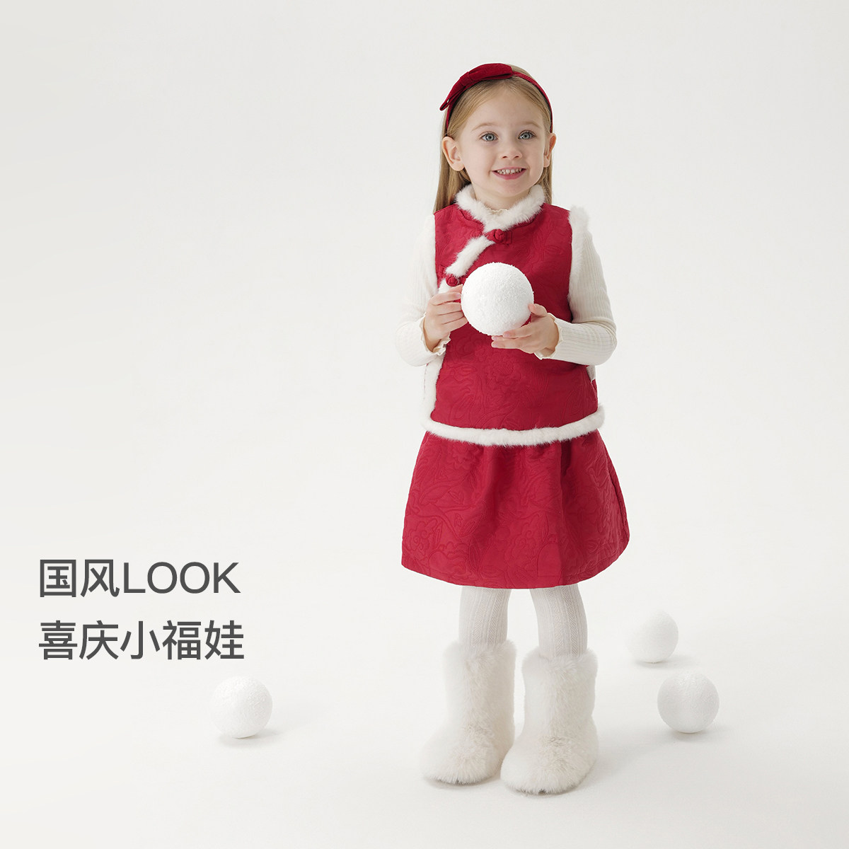 [新中式]马克珍妮女童仿兔毛盘扣加绒套装 宝宝新年红冬装232076
