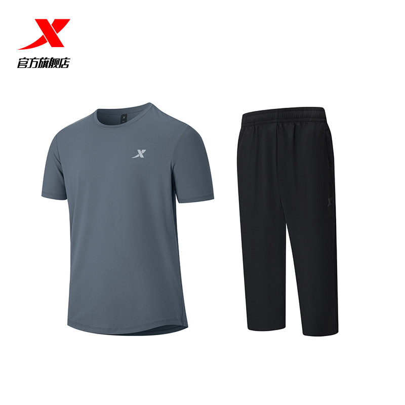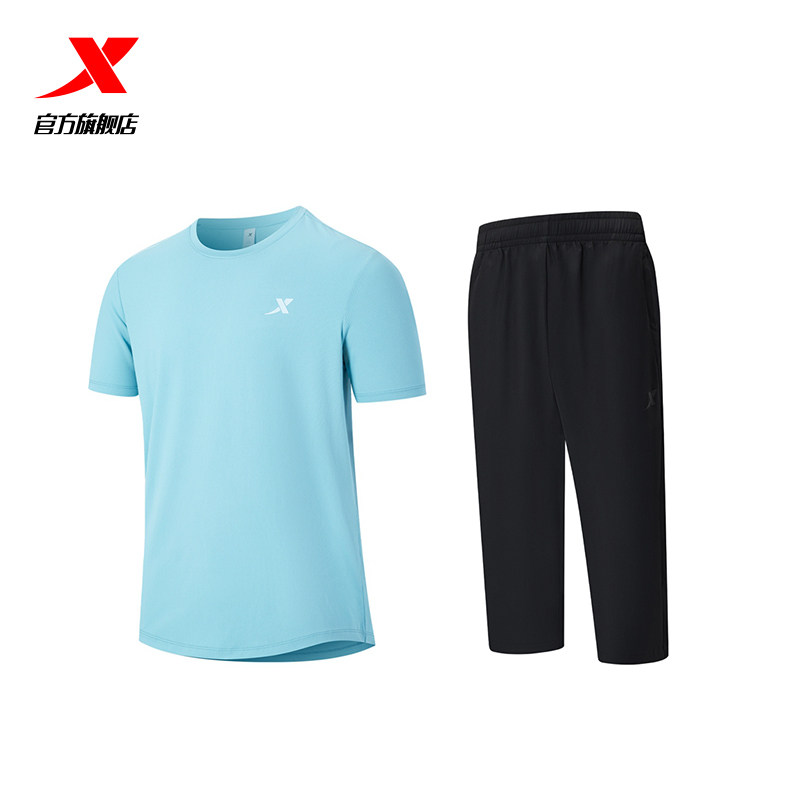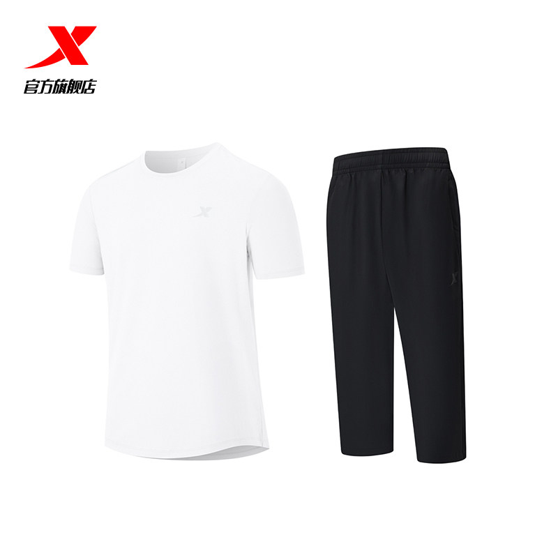 特步速干运动套装男士春夏季新款冰丝跑步骑行短袖t恤短裤七分裤