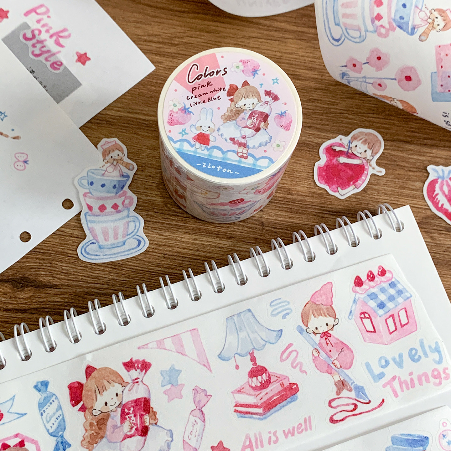 卓大王【莓红奶油盐蓝】阿卓配色系列胶带模切手帐拼贴手绘贴纸卷