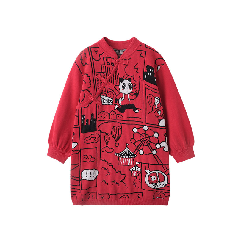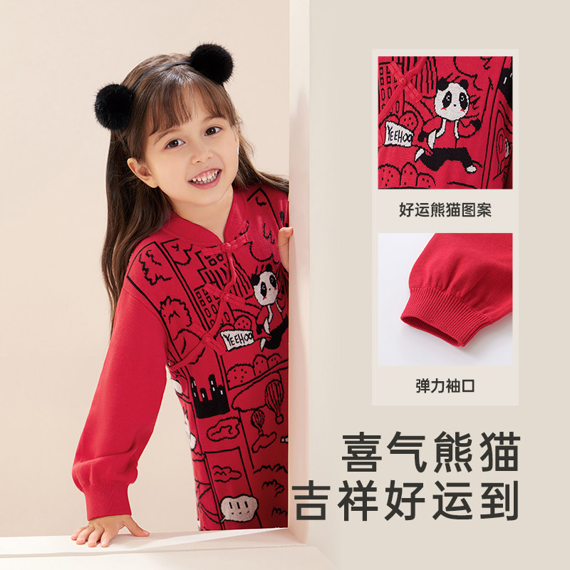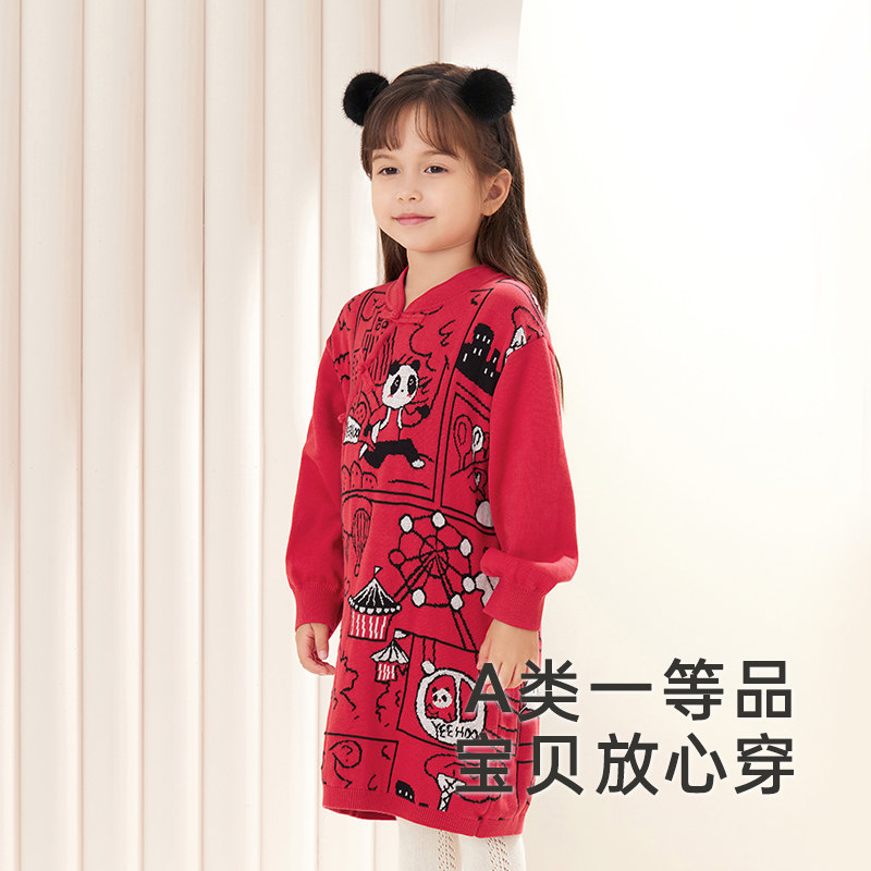 英氏女童连衣裙秋冬衣服针织裙子女宝宝拜年服新年过年喜庆红色