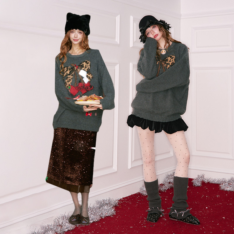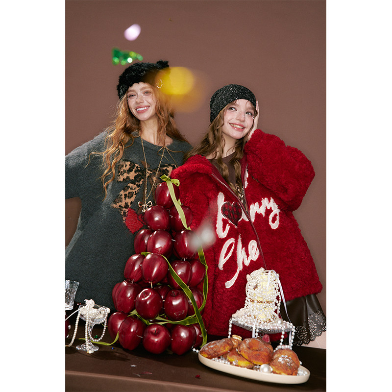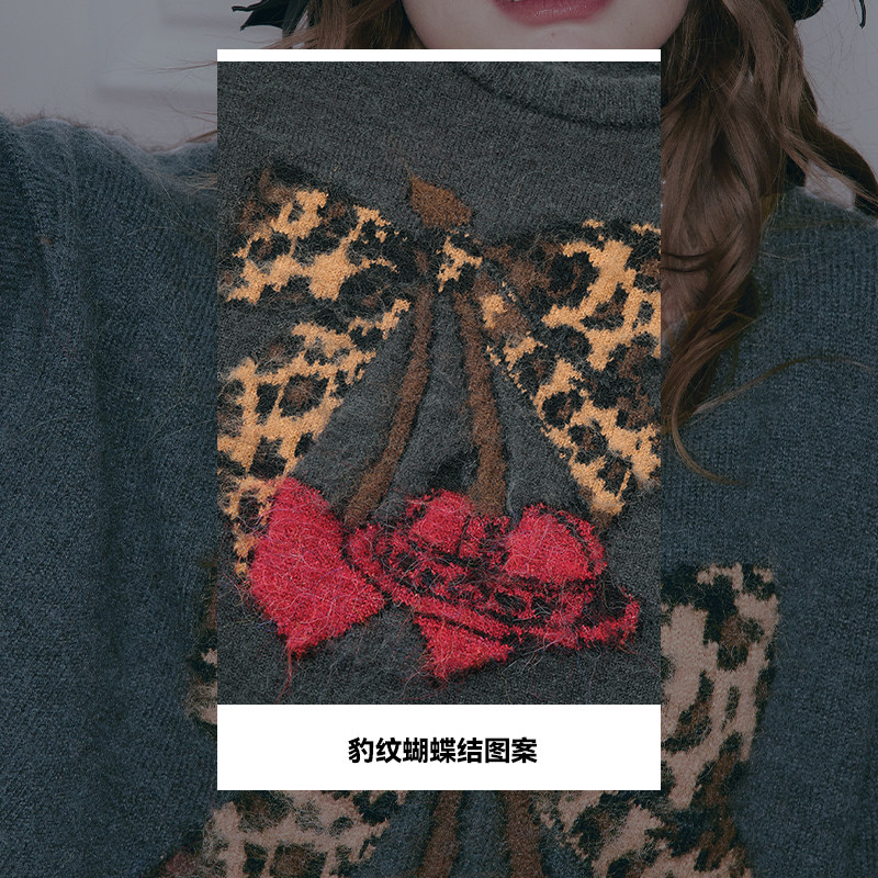 妖精的口袋豹纹樱桃拉毛甜美新年毛衣女2025年冬季新款慵懒高级感
