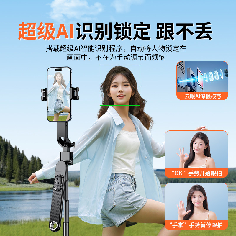 AI智能跟拍云台}2025新款自拍杆360度旋转手机自拍神器通用自动人脸直播拍摄支架专用便携落地三脚架手持防抖