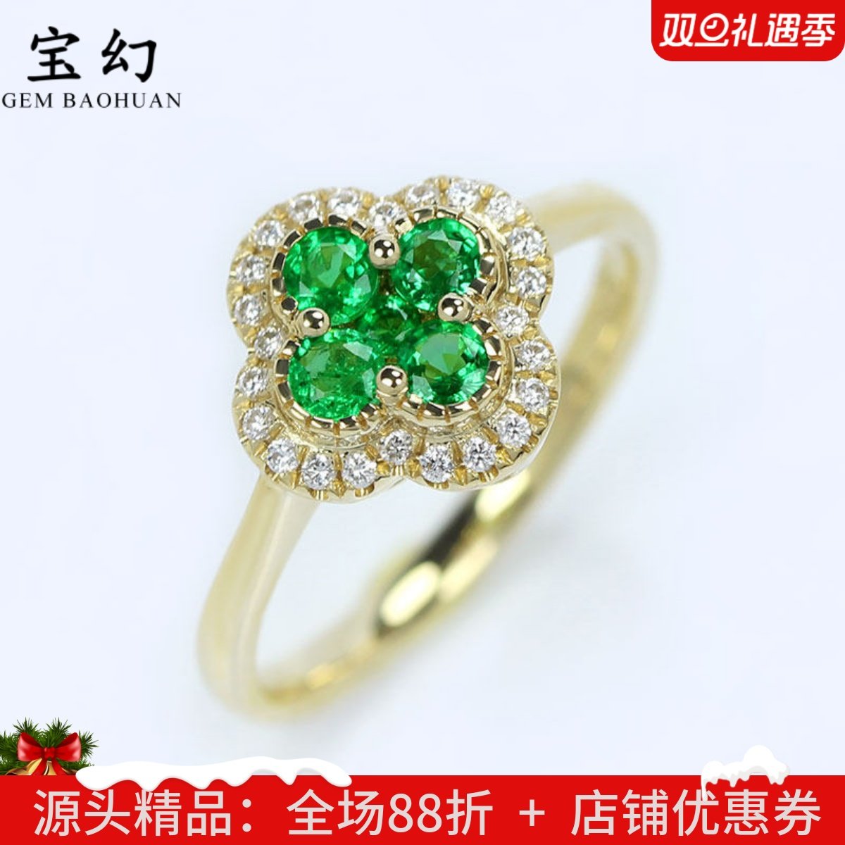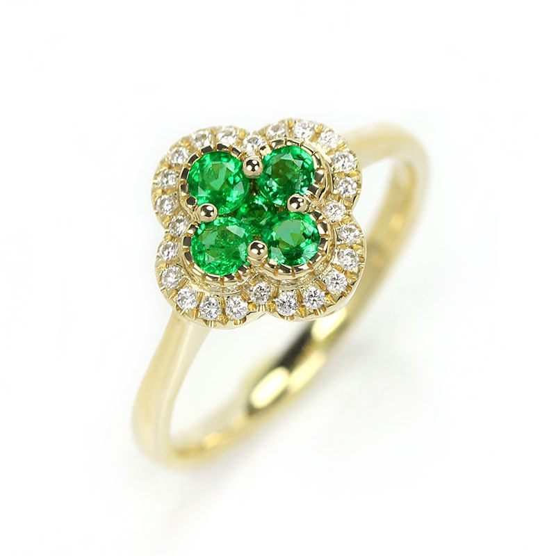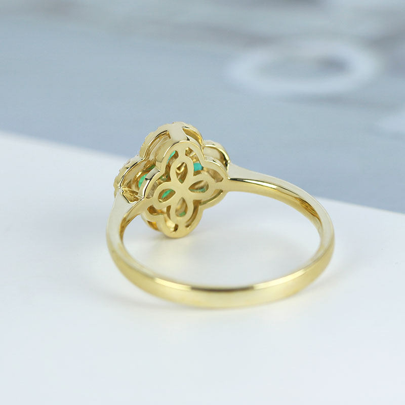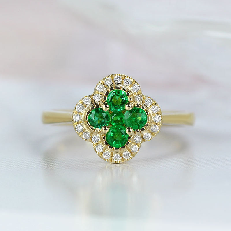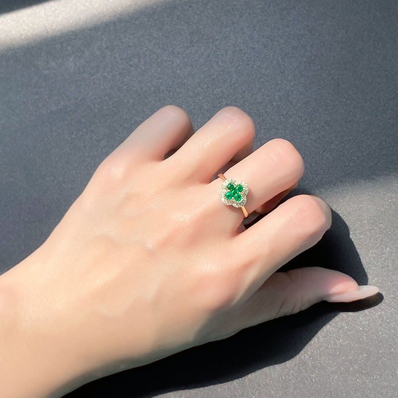 18K黄金天然祖母绿幸运四叶草戒指 翠亮绿宝石镶钻石指环女款定制