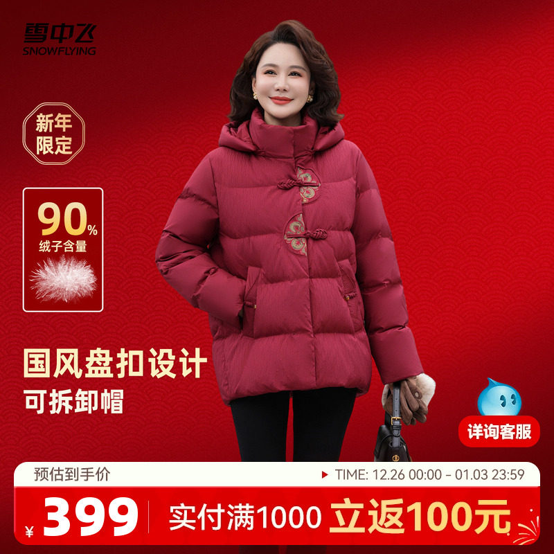 雪中飞2025冬新款新中式短款羽绒服女士妈妈花纹盘扣保暖洋红