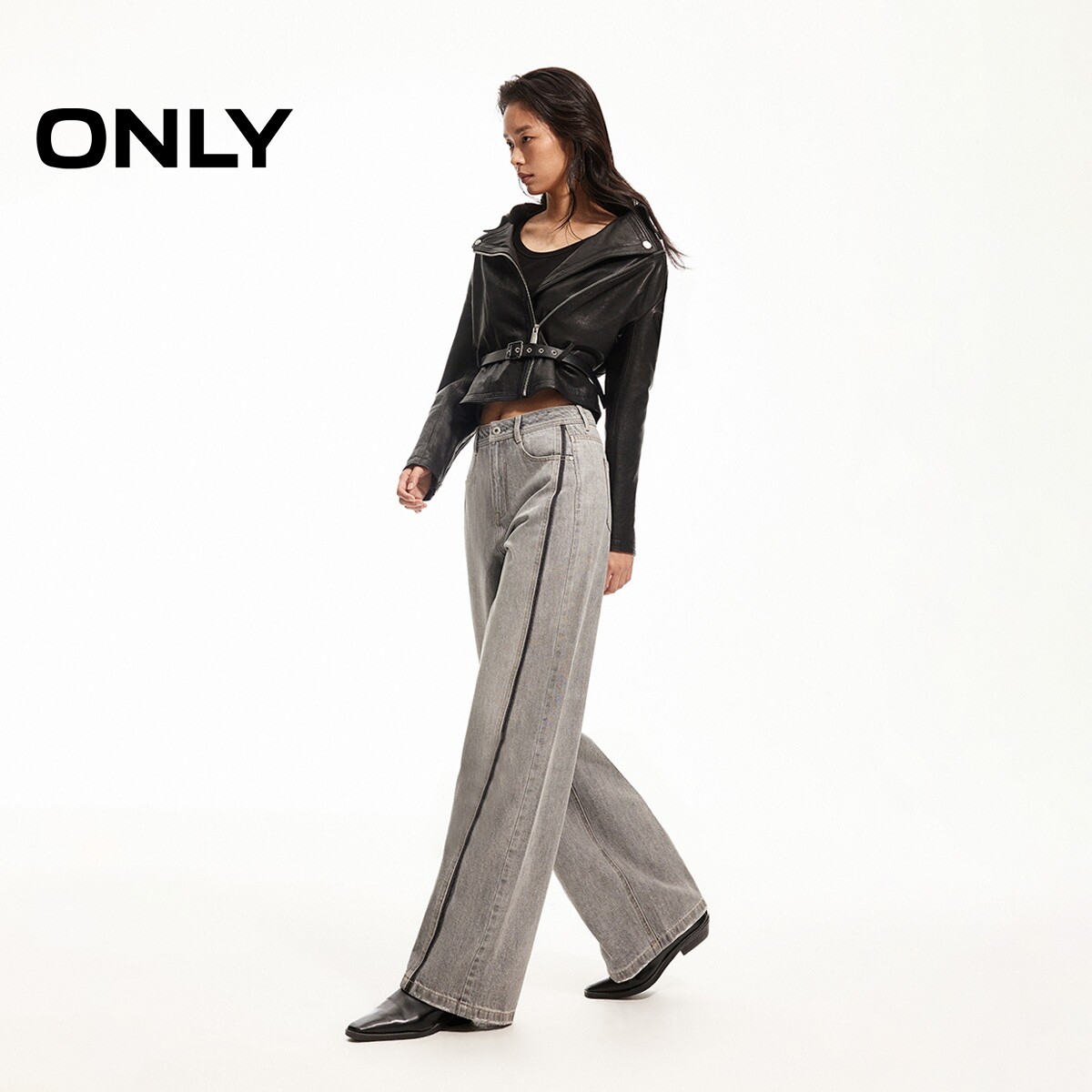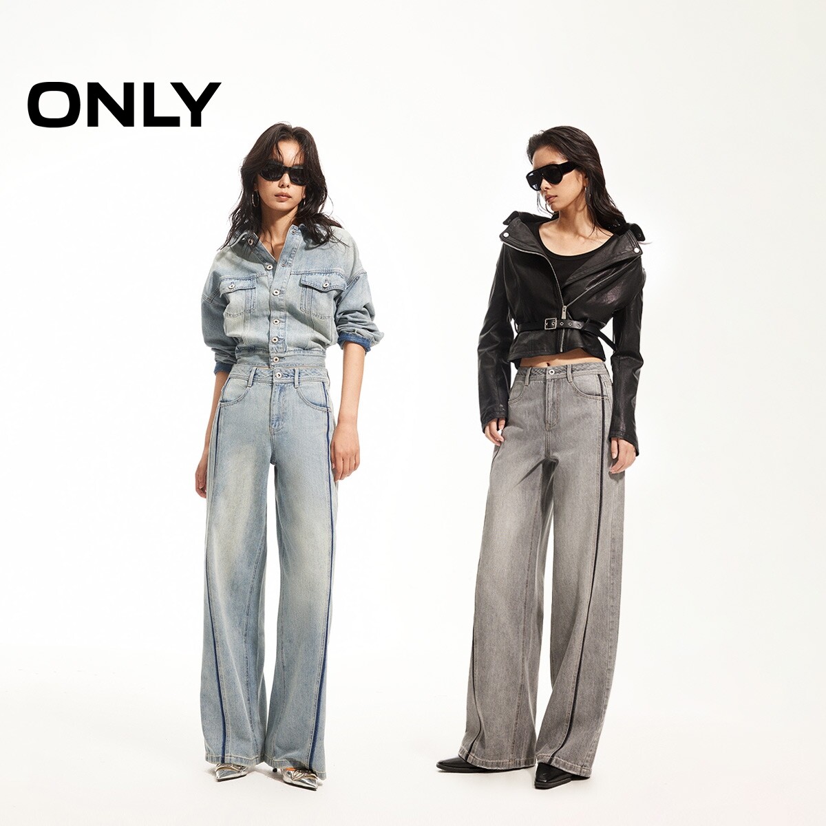 ONLY2026春季新款个性撞色水洗设计宽松高腰直筒裤长裤牛仔裤女