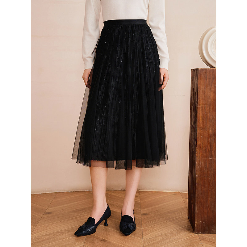 YINER音儿专选2025春季新款法式亮丝小黑裙三层网纱A字高腰半身裙
