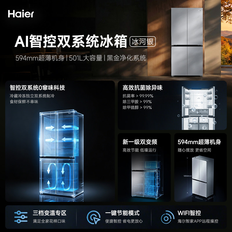 智控双系统大容量冰箱,抗菌除味,三档变温
