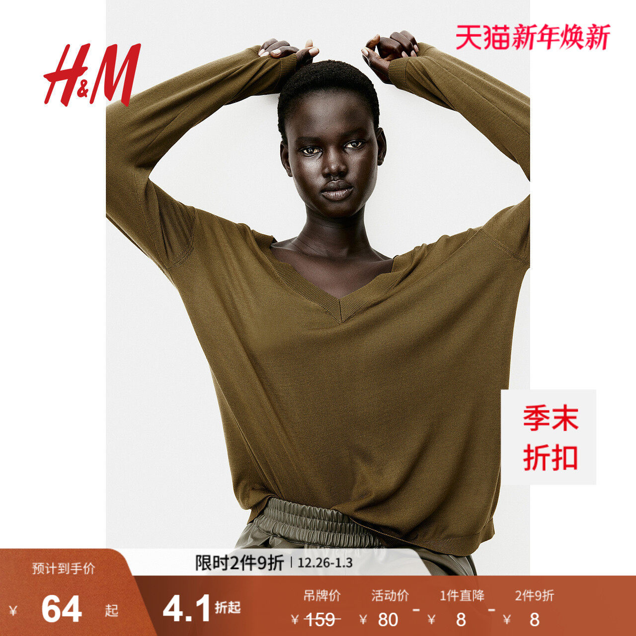 HM女装毛针织衫冬季长袖中长款宽松V领针织套衫1239455