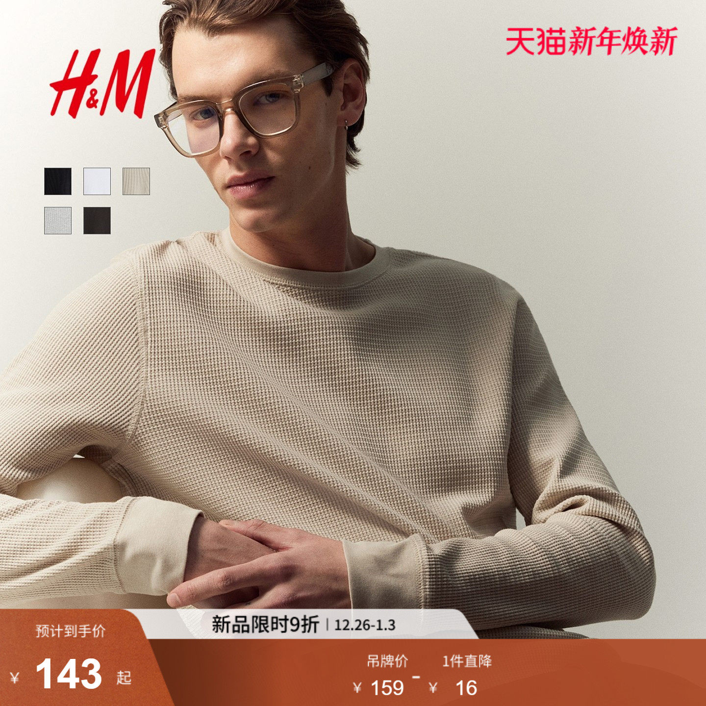 HM男装女装T恤冬季圆领休闲时尚正肩华夫格套头长打底衫0795243