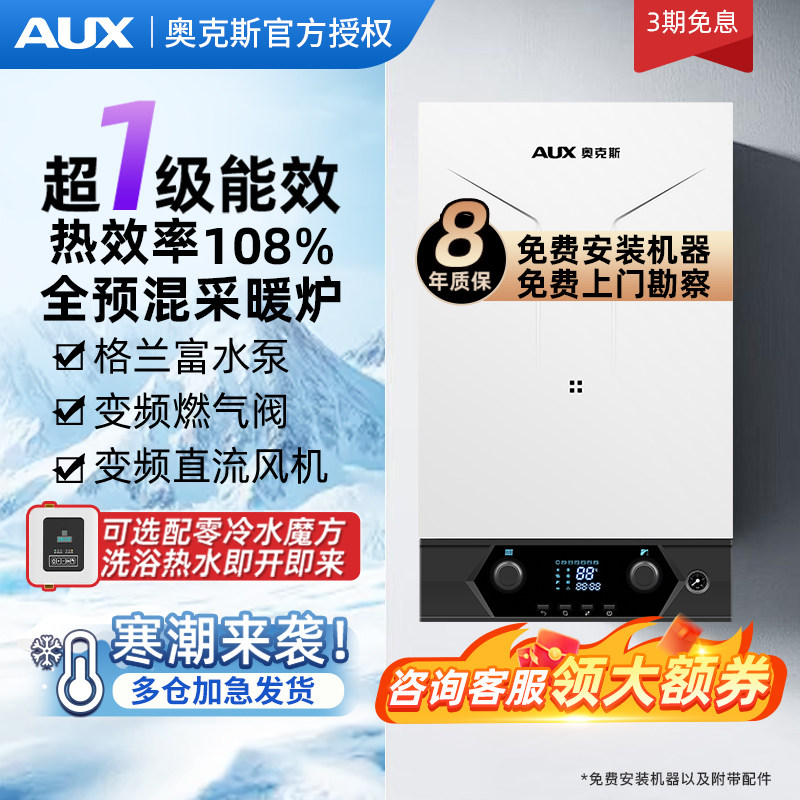 奥克斯全预混壁挂炉1级能效天然气家用采暖热水两用燃气地暖锅炉