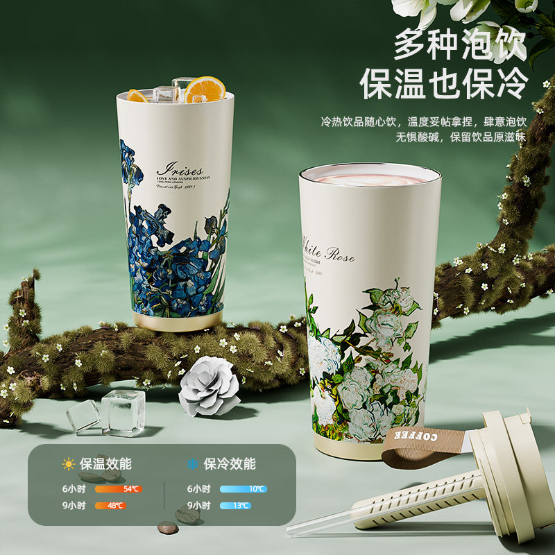 万兀马克杯不锈钢玻璃内胆保温杯高颜值两用吸管杯办公室喝水杯子