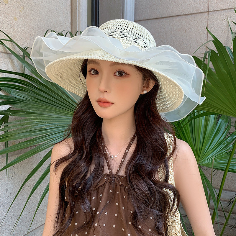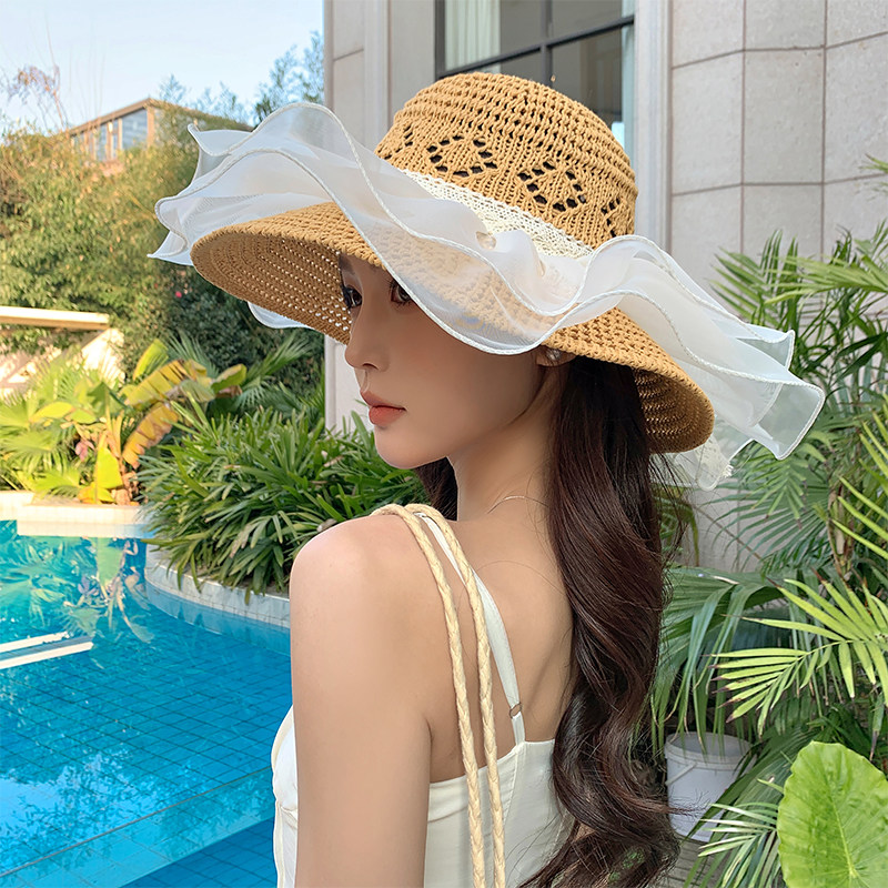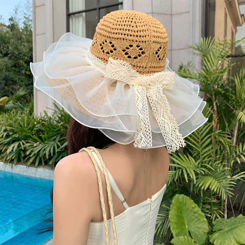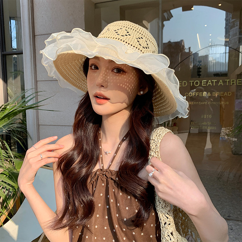 法式蕾丝草编渔夫帽子女夏季户外出游防晒帽大帽檐镂空透气太阳帽