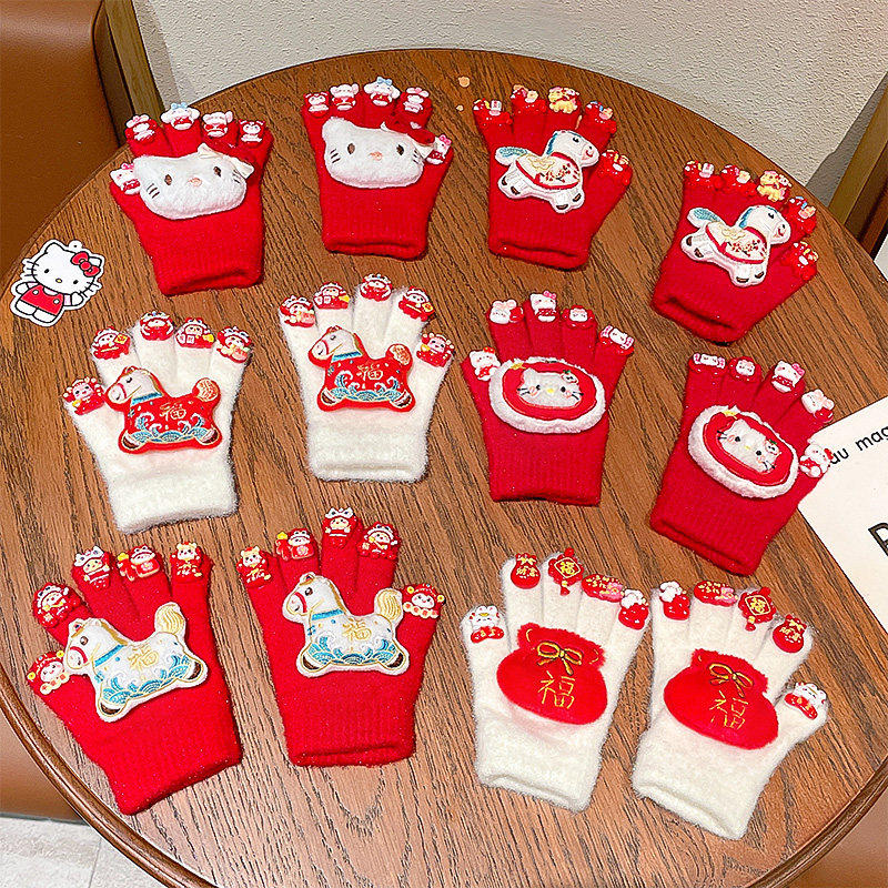 新年儿童手套冬季女孩可爱马年加绒五指套女童保暖分指套美甲萌可