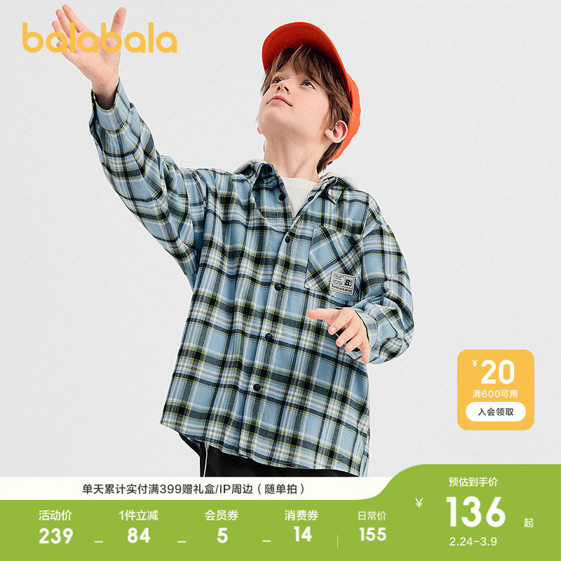 巴拉巴拉童装男童衬衫儿童长袖2025新款秋绒绒棉格纹外套时尚潮酷