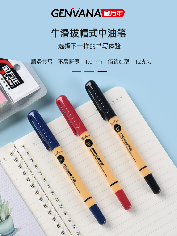 1.0mm金万年牛滑圆珠笔顺滑粗头中油笔蓝色加粗特粗红笔老式黑色老师专用红色大头油笔笔芯练字红粗芯原子笔
