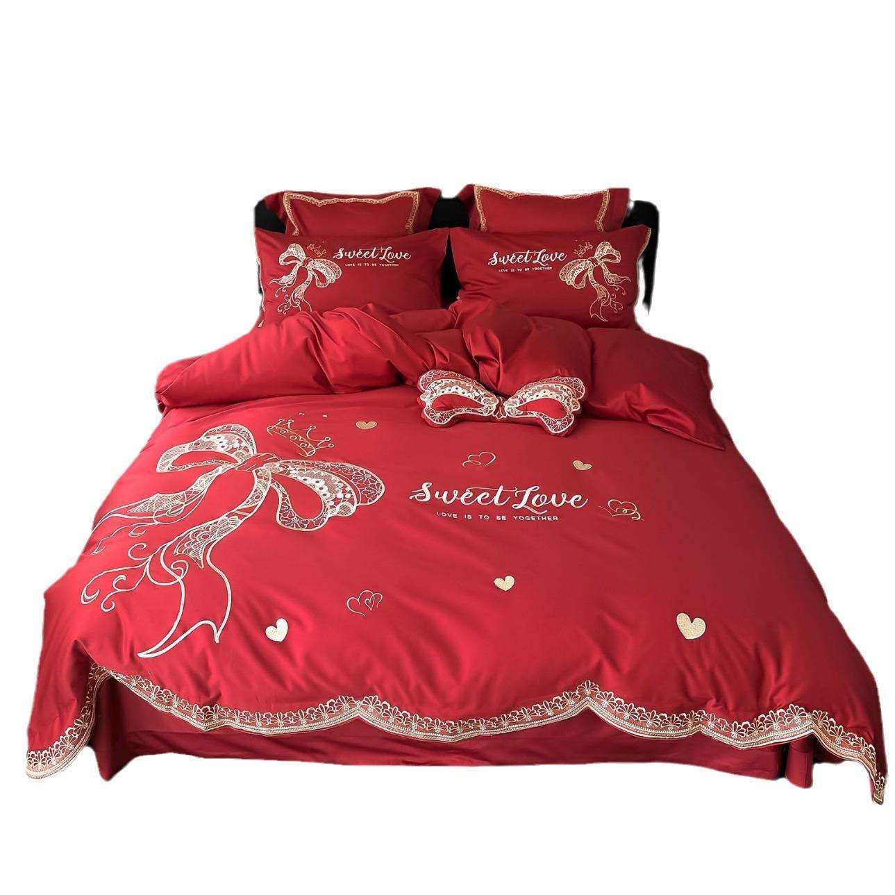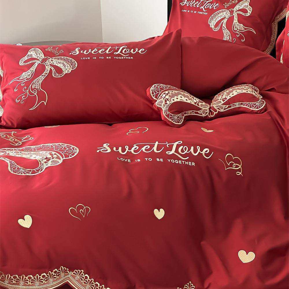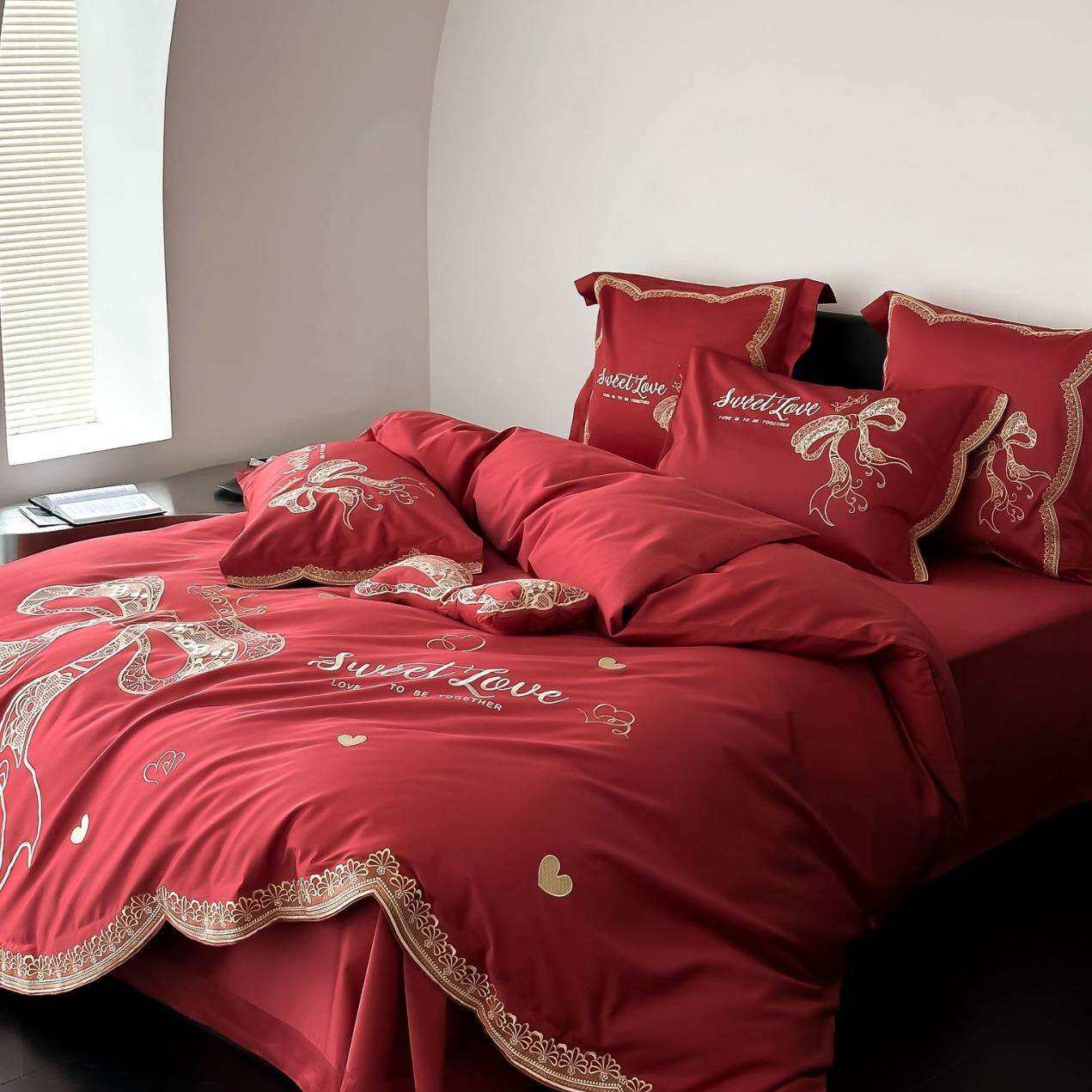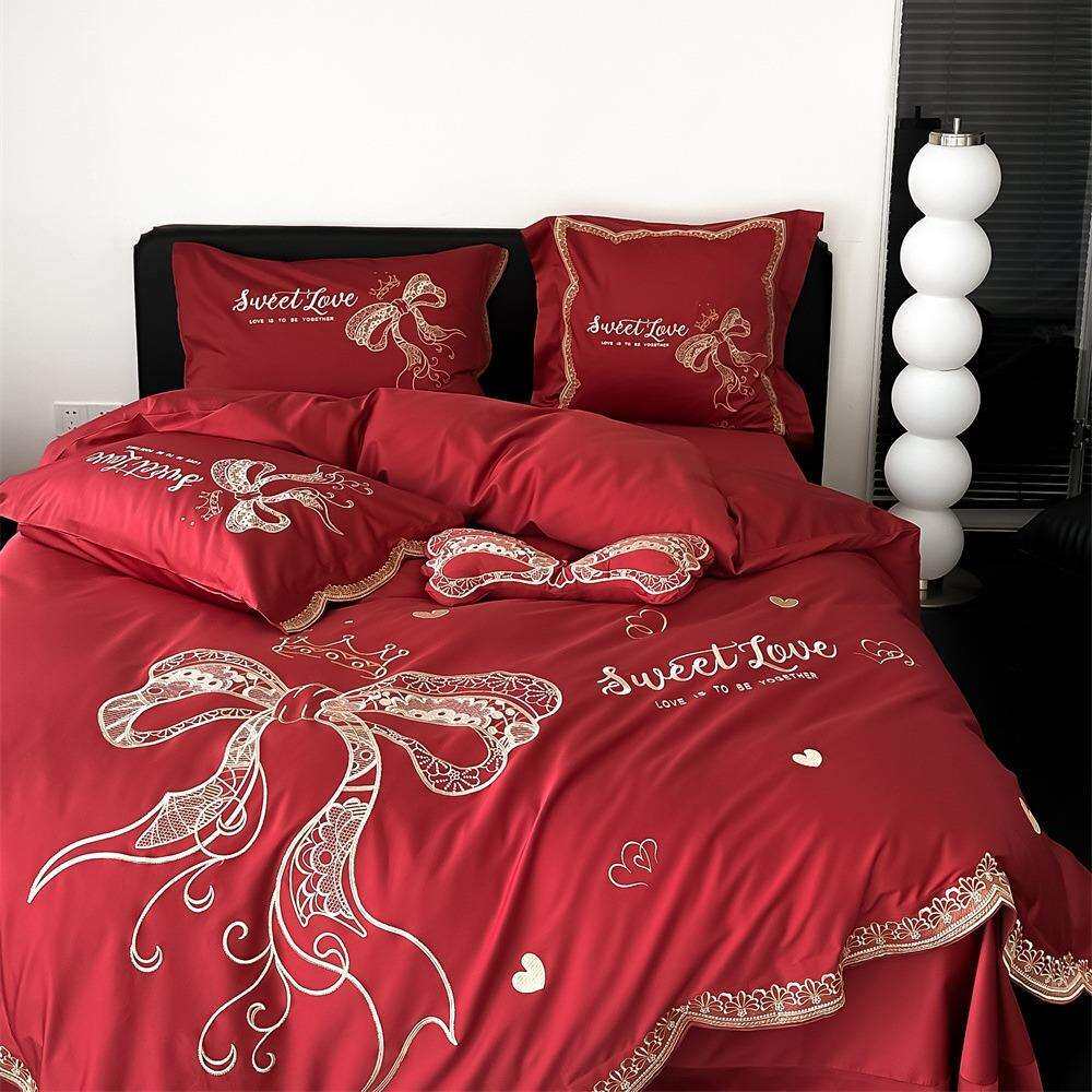 喜庆大蝴蝶结绣花春夏新品100s双股澳棉全棉大红色被单婚庆款套件