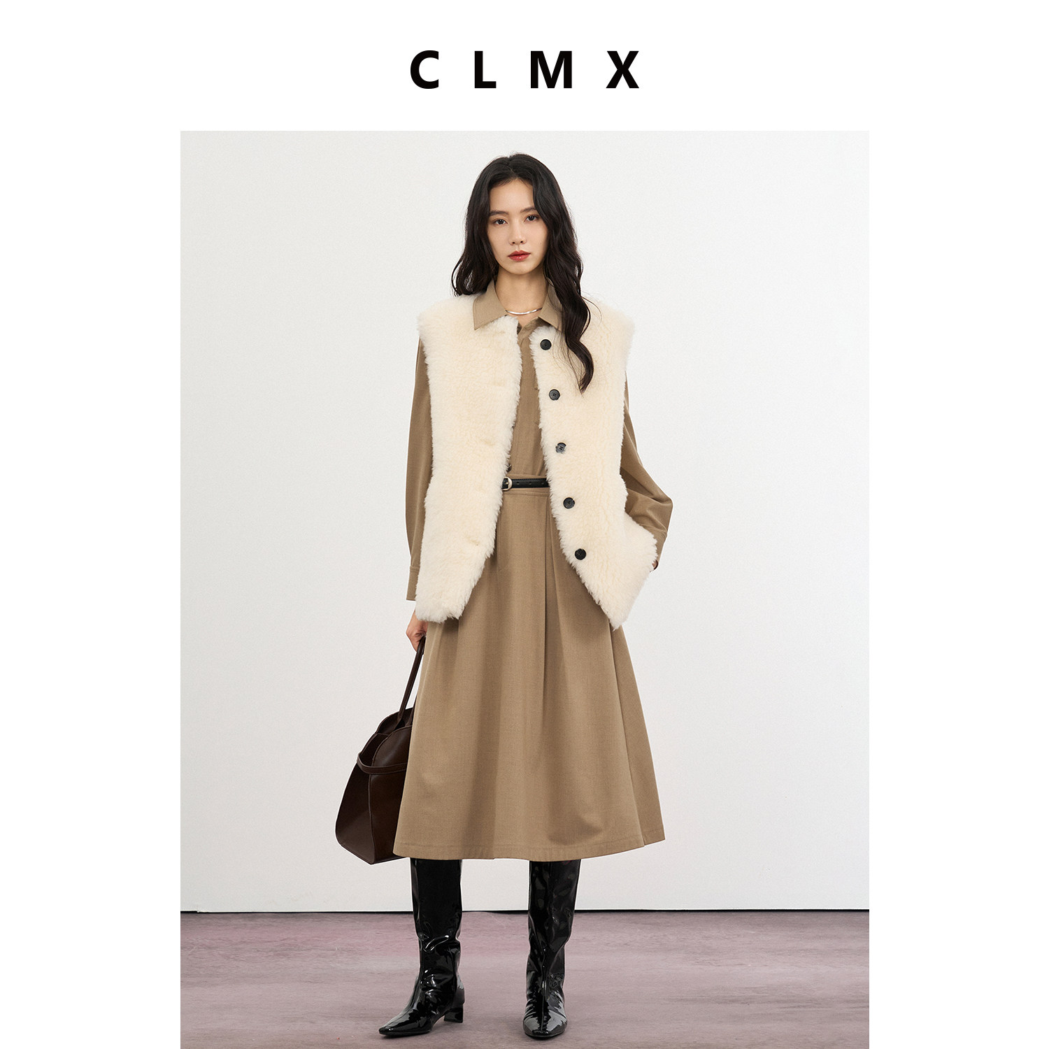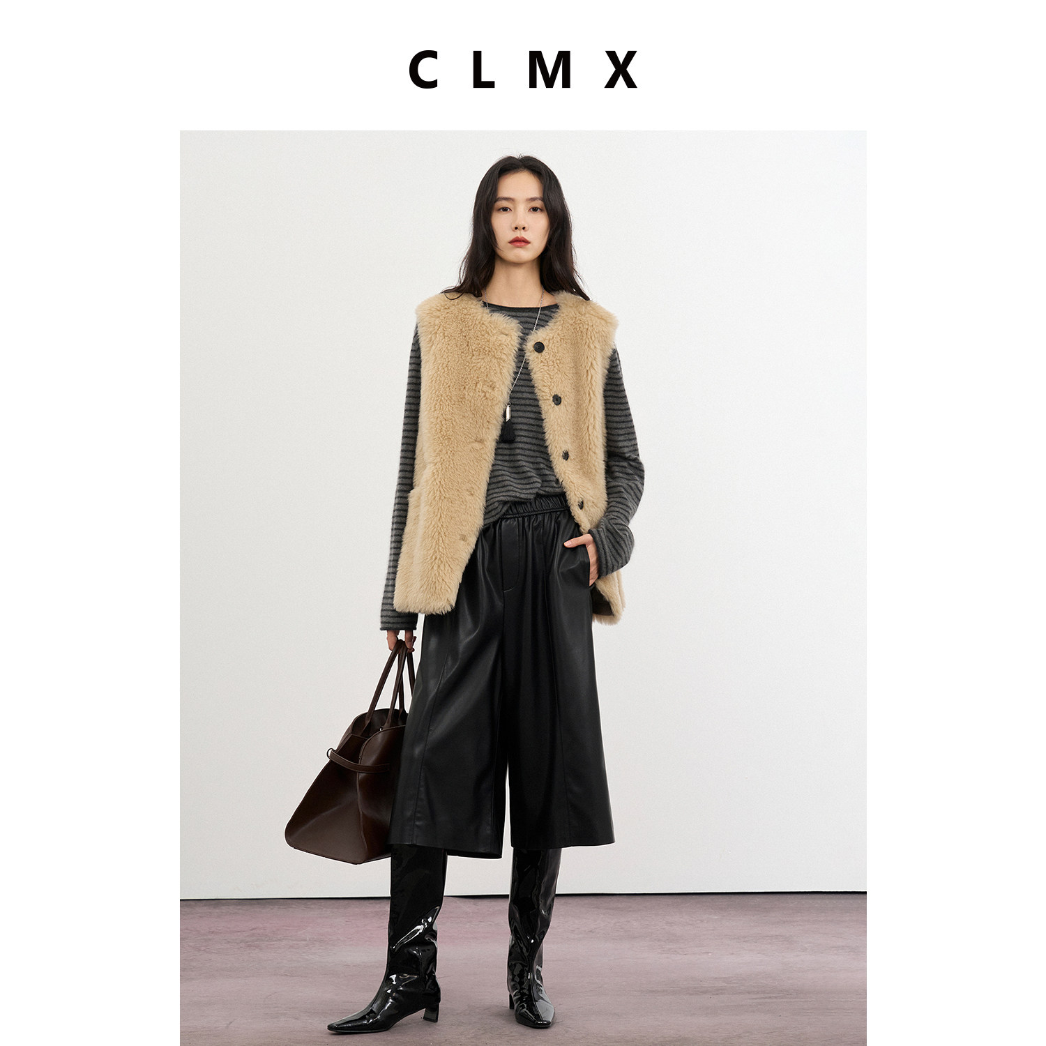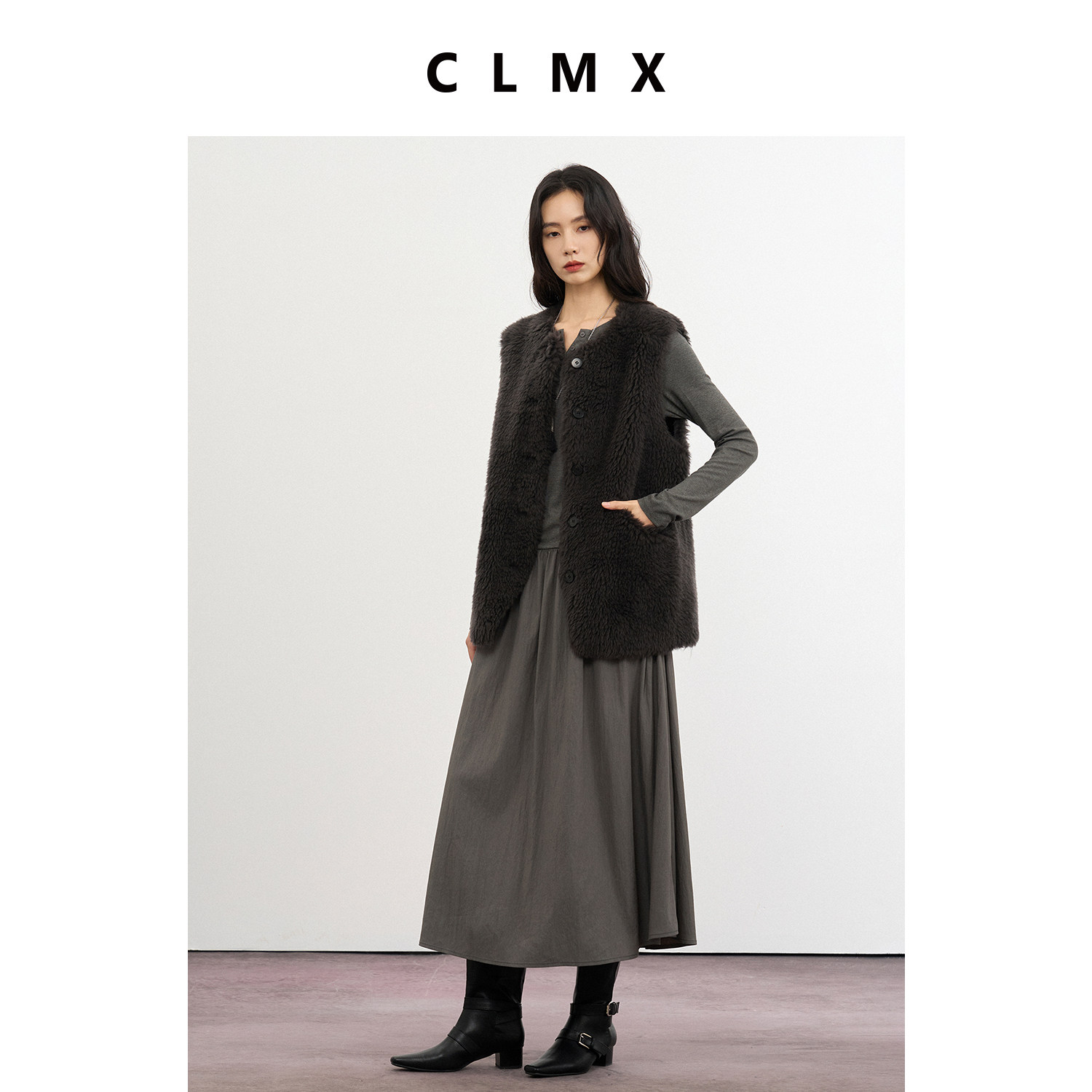 CLMX纯色时髦减龄圆领开襟马甲100%绵羊毛秋冬通勤上衣女
