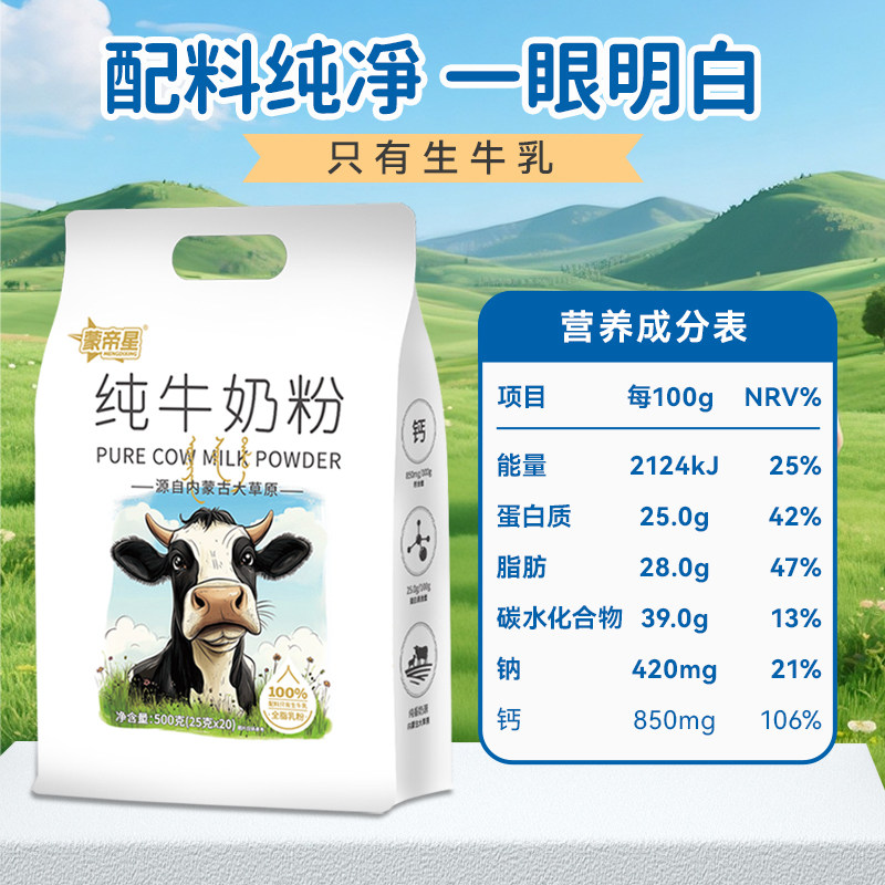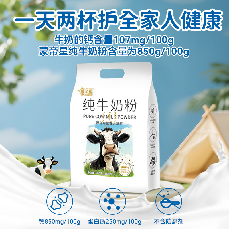 内蒙古纯牛奶粉500g全脂无蔗糖高钙营养成人中老年学生青少年奶粉