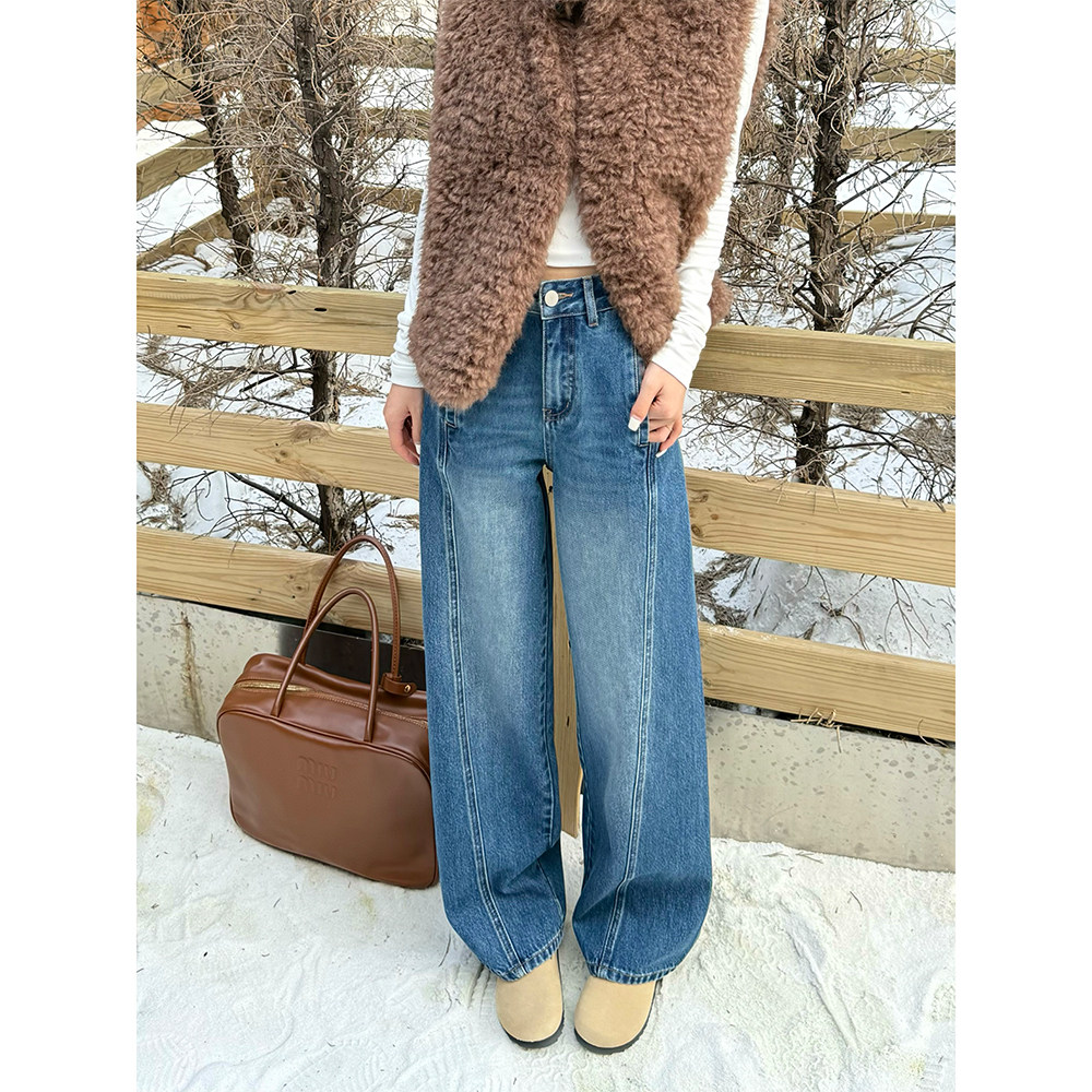 王家有鱼加绒小个子复古蓝直筒阔腿裤女2025年秋冬新款百搭牛仔裤