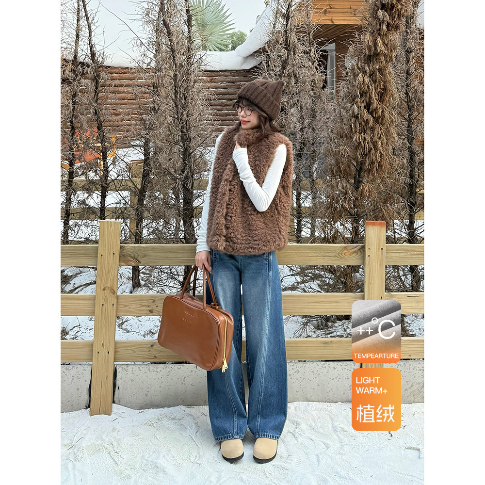 商场同款|森柔森马牛仔裤女冬高腰半松紧腰抓毛2025新款阔腿长裤