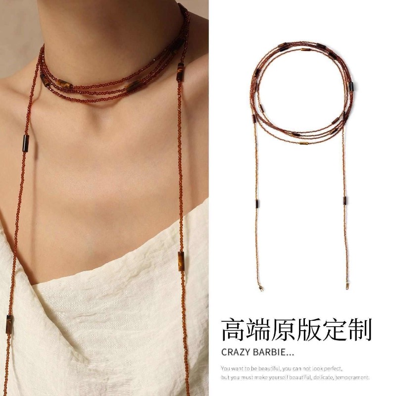 多层咖色水晶串珠长款项链女choker轻奢高级感虎眼石叠戴挂脖颈链