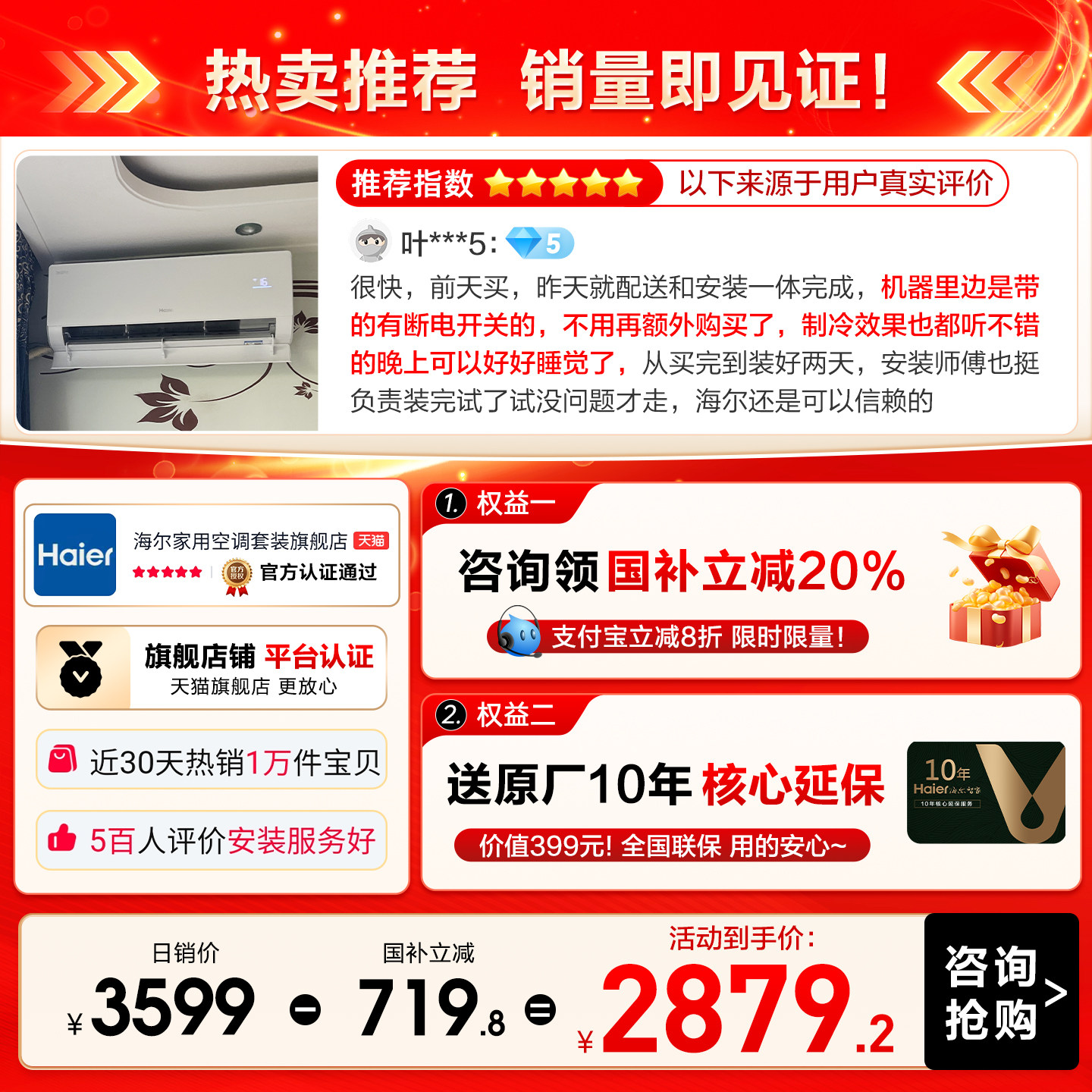 【国补8折】海尔空调1.5匹家用一级能效变频卧室挂机冷暖E1旗舰店