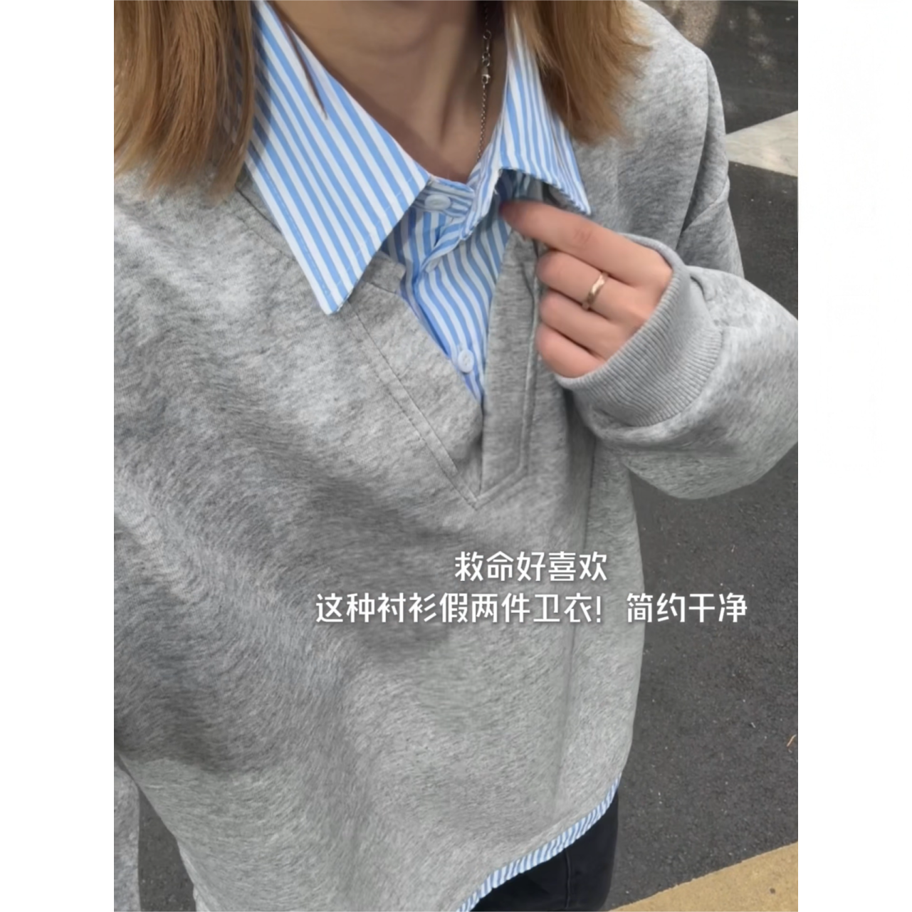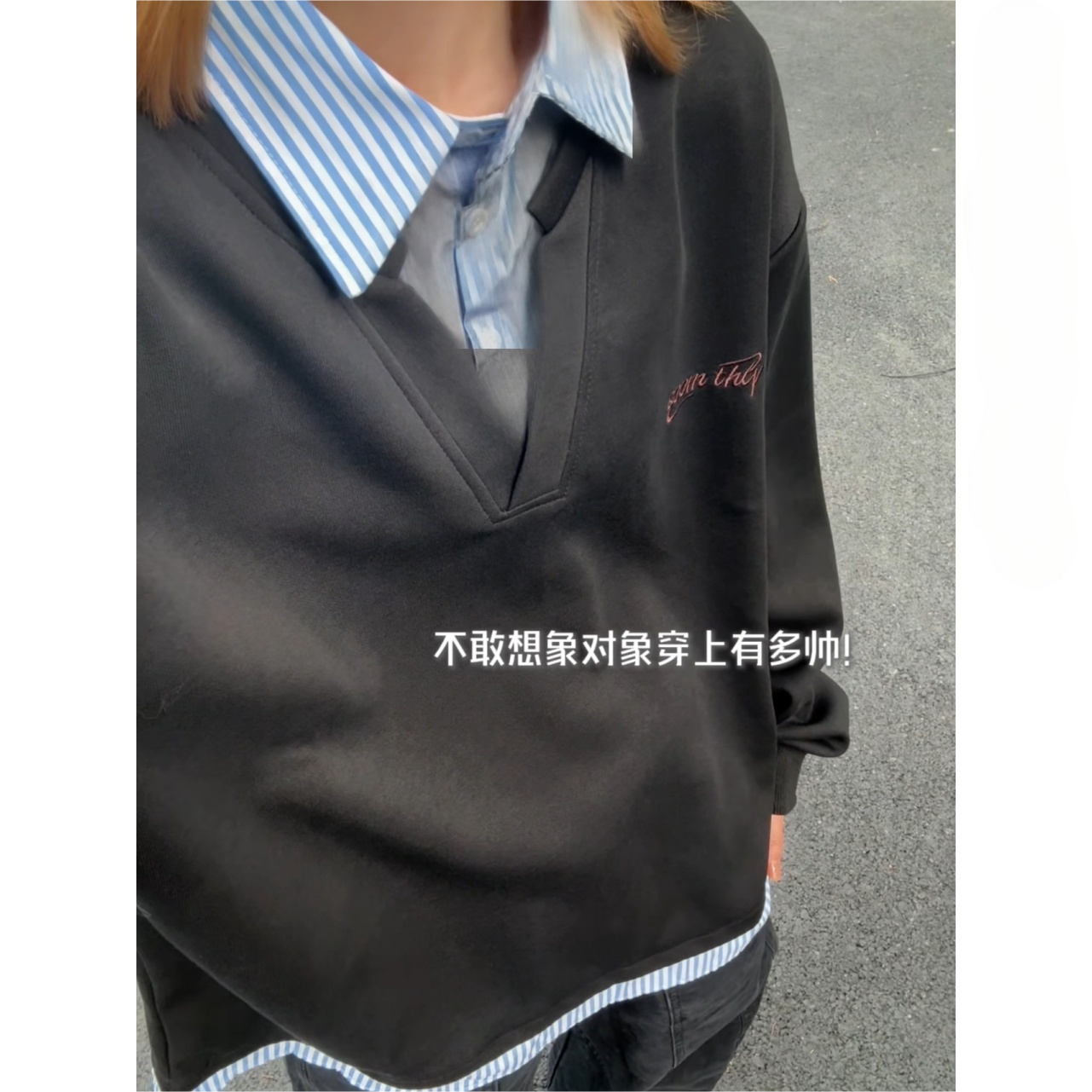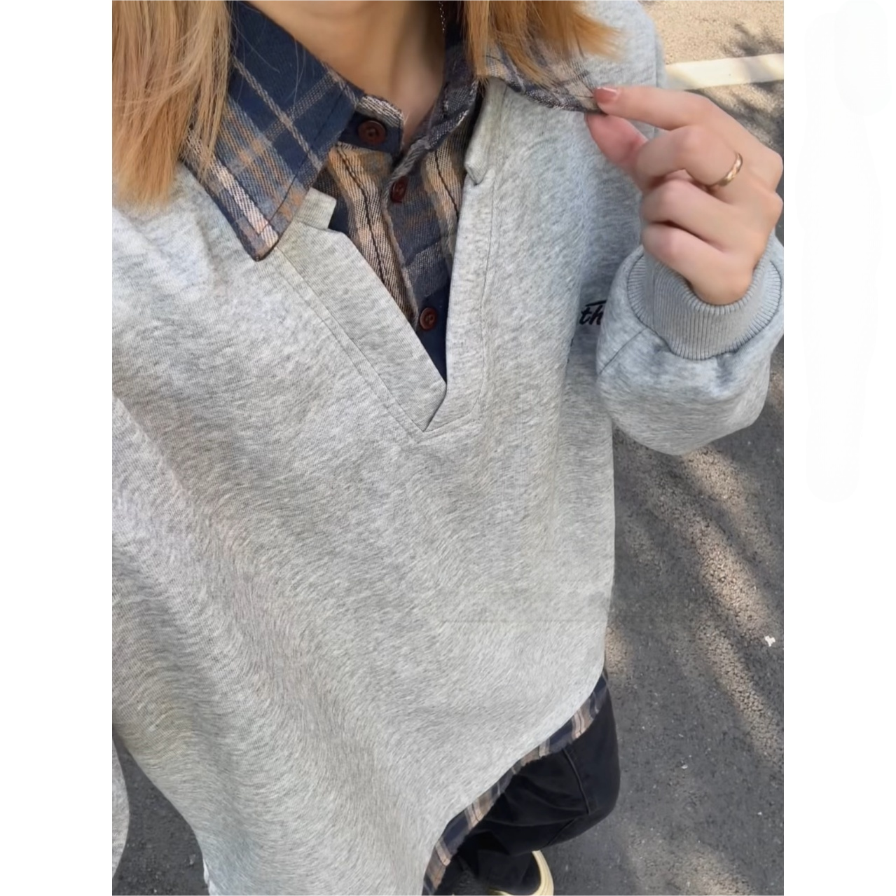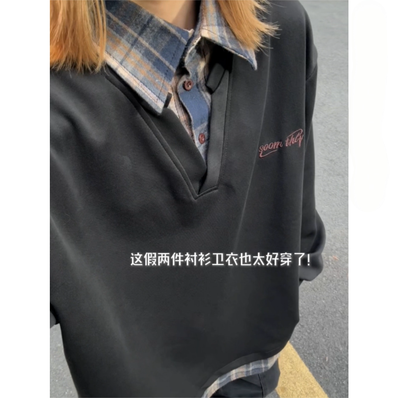 假两件拼接衬衫领卫衣男女春秋季美式复古格子上衣学院风情侣外套