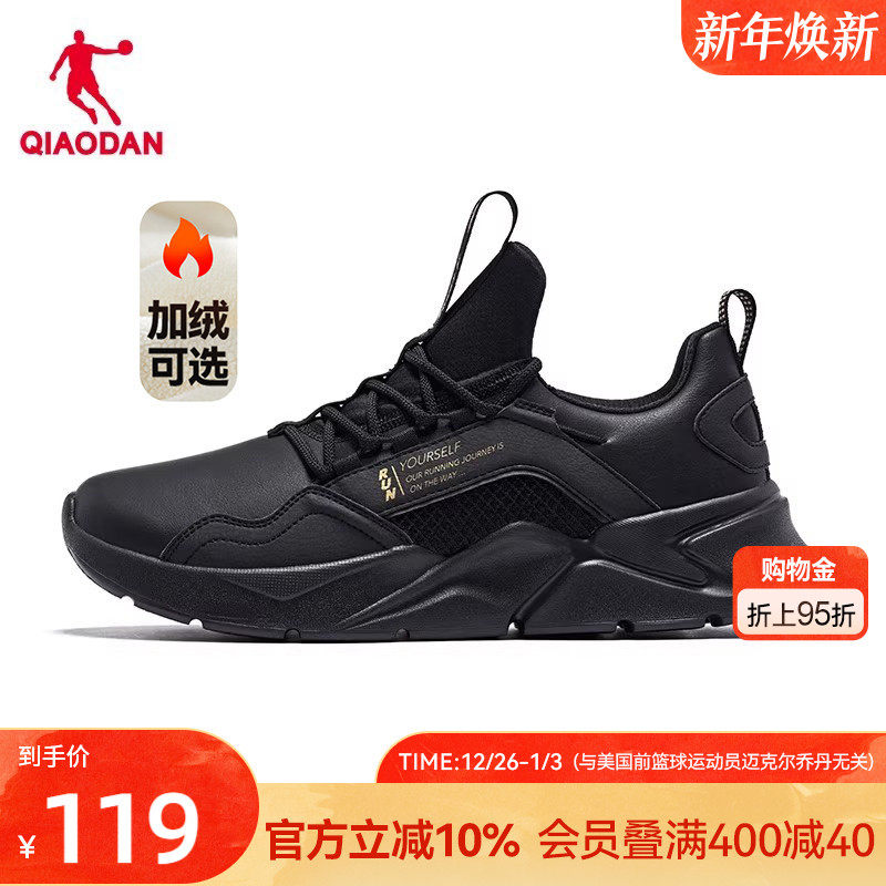 乔丹冬季加绒运动鞋皮面防水男鞋减震轻便软底爸爸跑步鞋黑色跑鞋