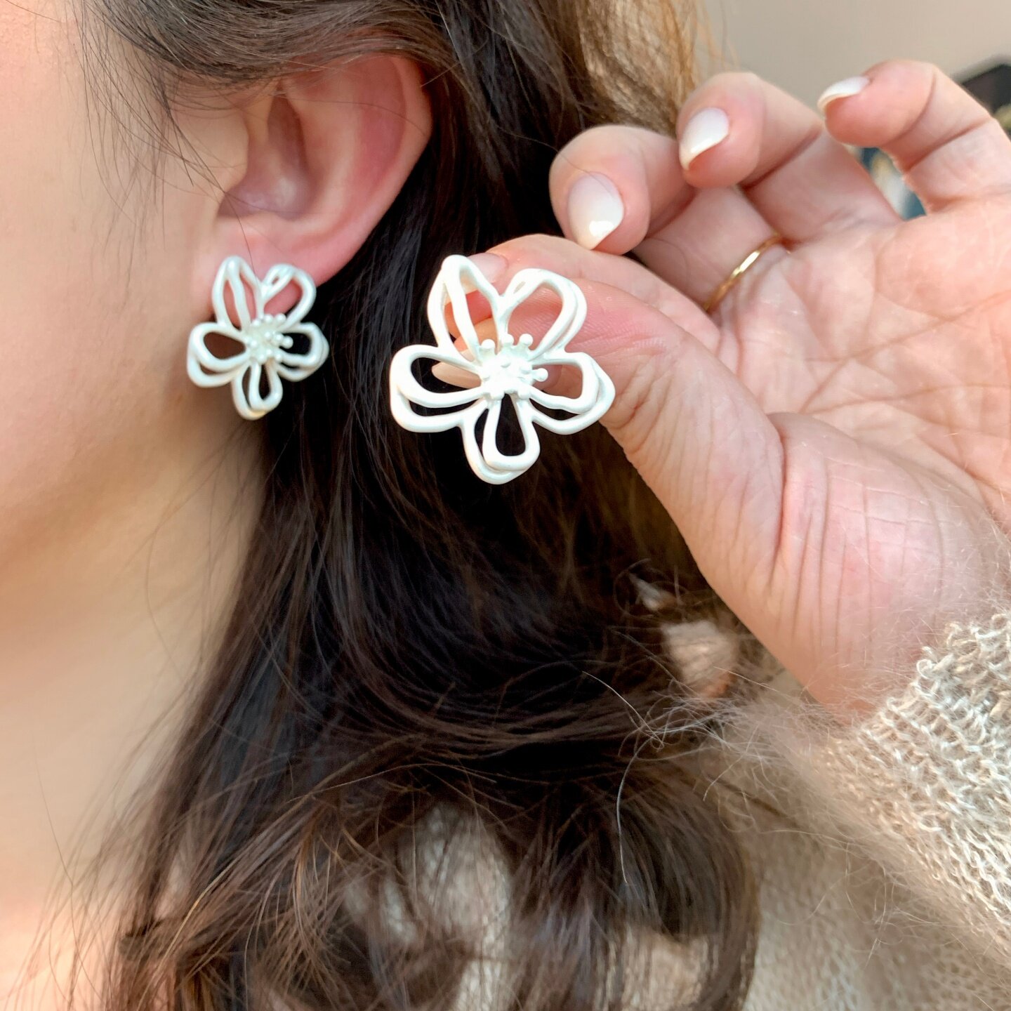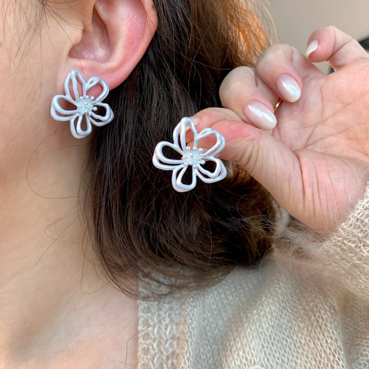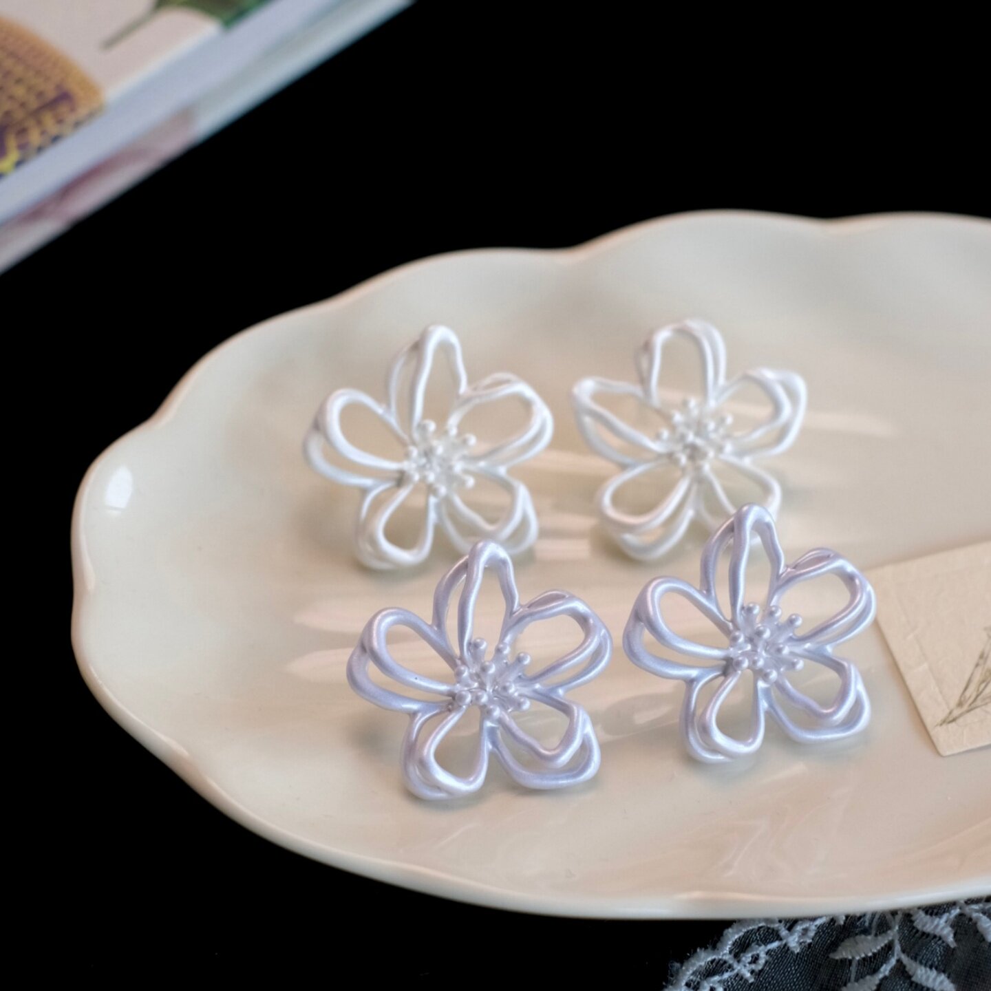 《拾花酿春》夏天超仙白色雾霾蓝双层花朵镂空耳夹耳饰耳钉耳环女