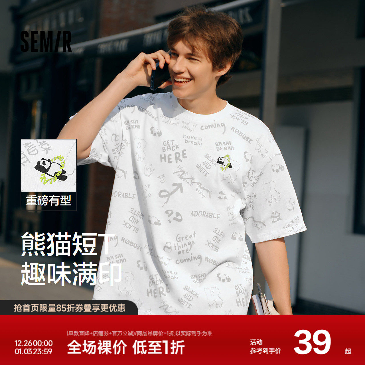 森马短袖T恤男熊猫字母满印情侣装oversize夏季上衣设计感小众潮
