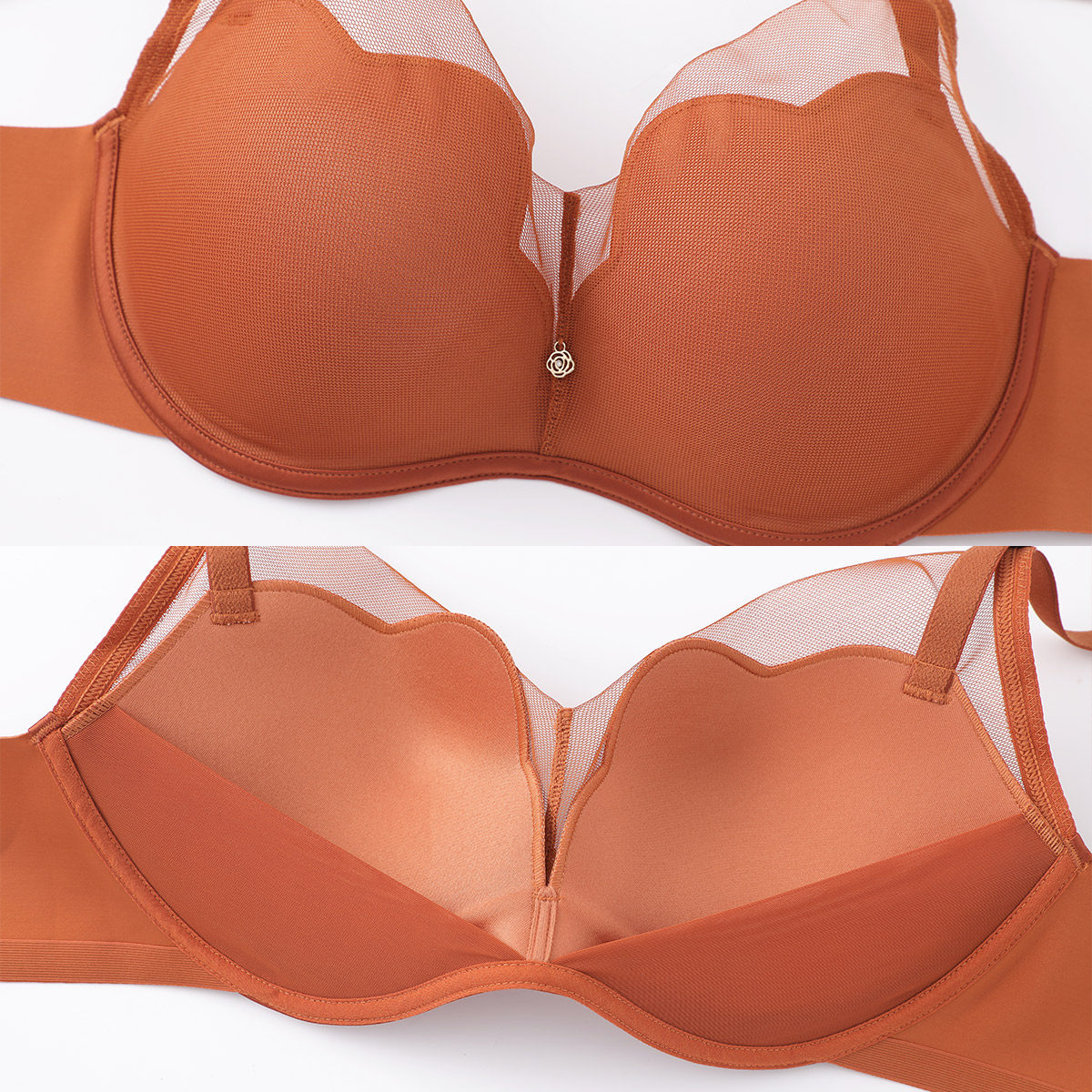 润微茶肌内衣女士大胸显小薄款收副乳聚拢大码上托防下垂蕾丝文胸