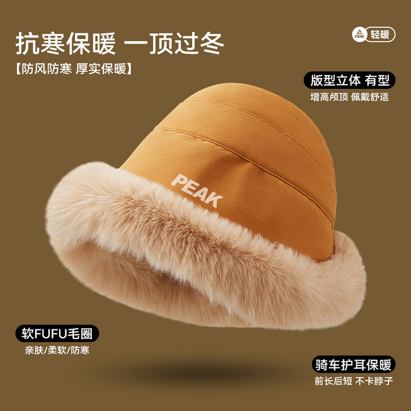 匹克冬季保暖女士渔夫帽加绒加厚显脸小盆帽骑车护耳帽子骑行防寒
