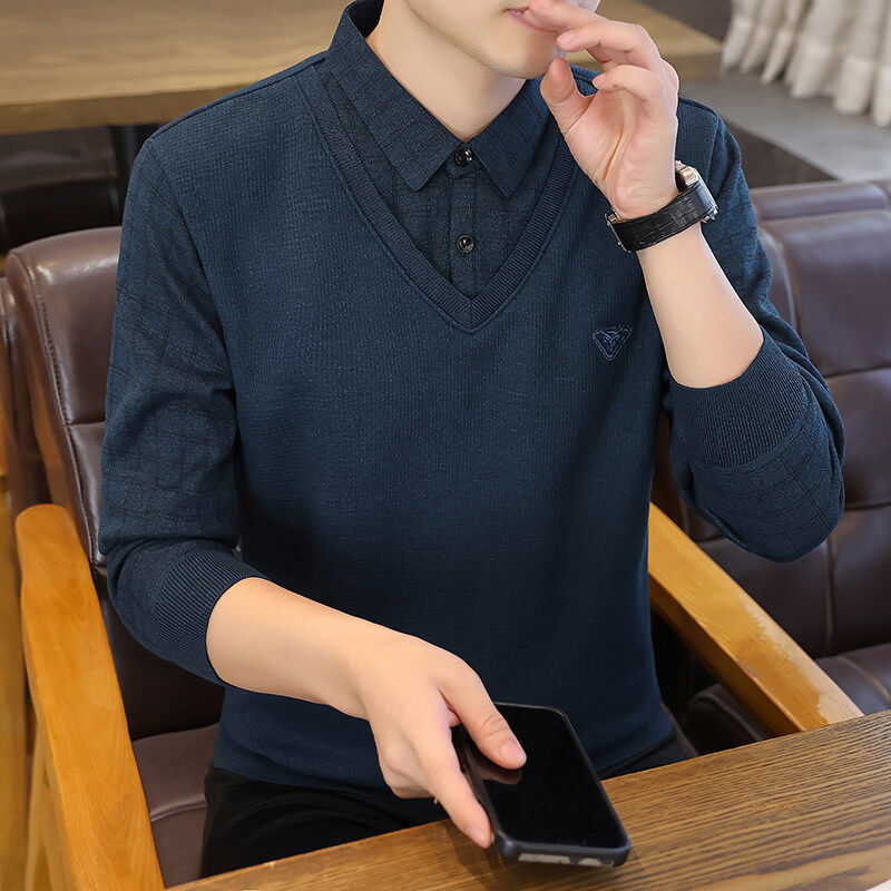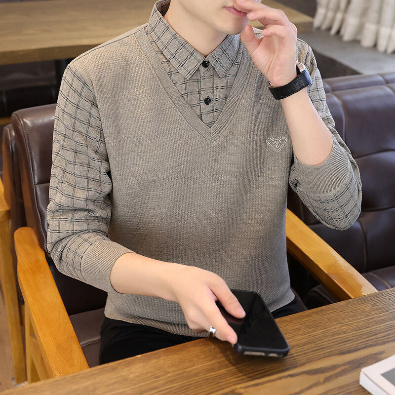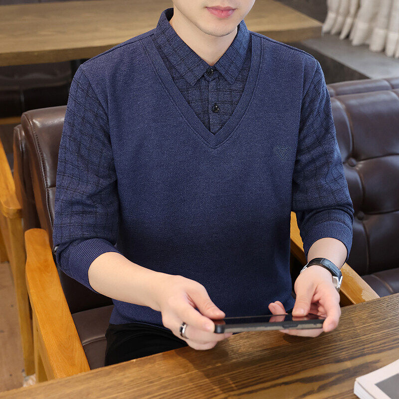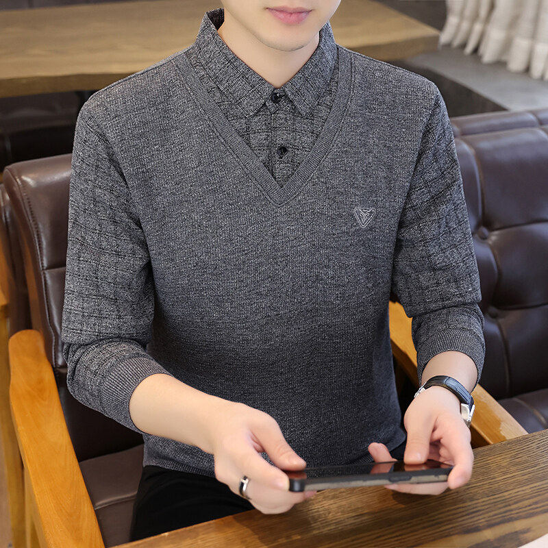 秋冬季中青年男士毛衣针织衫加绒加厚长袖韩版潮流假两件男衬衫领